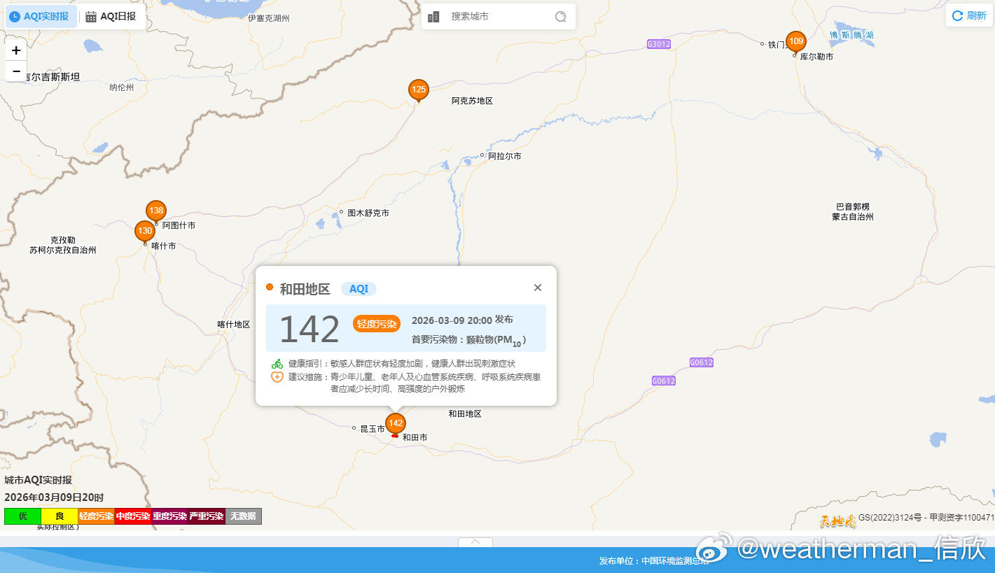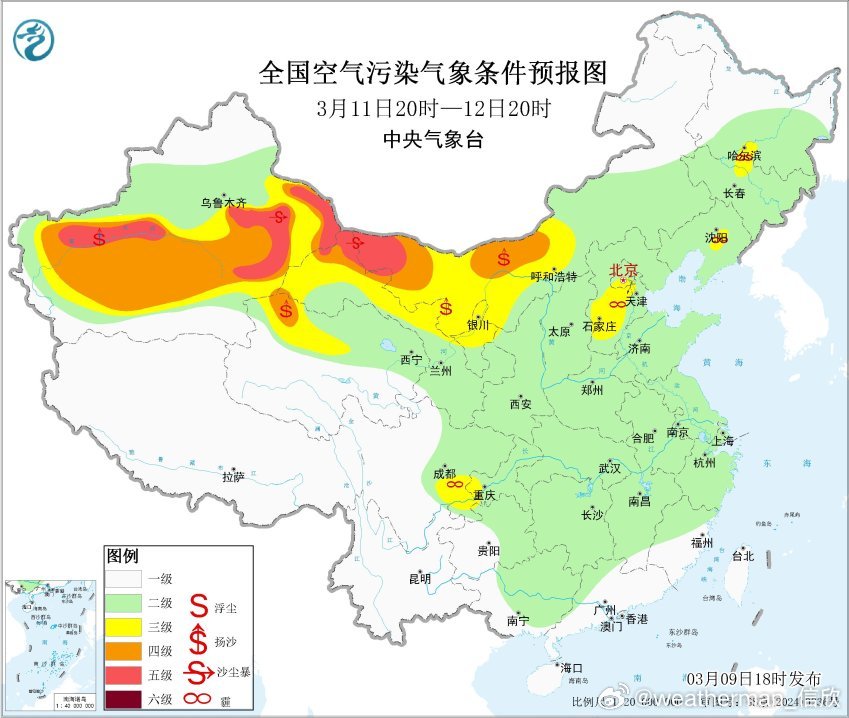 【雾 霾 沙尘】今晚到明天,南方降雨缩减,明晨在四川重庆贵州湖南江西等地,要警惕可能出现分散的大雾。从今晚空气质量看,山西河南安徽湖北湖南等地,存在一定程度的污染,对应有霾。未来2天,霾可能会持续。今天新疆塔里木盆地的沙尘减弱。