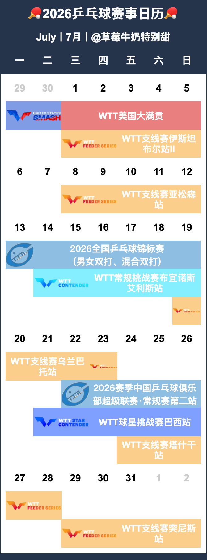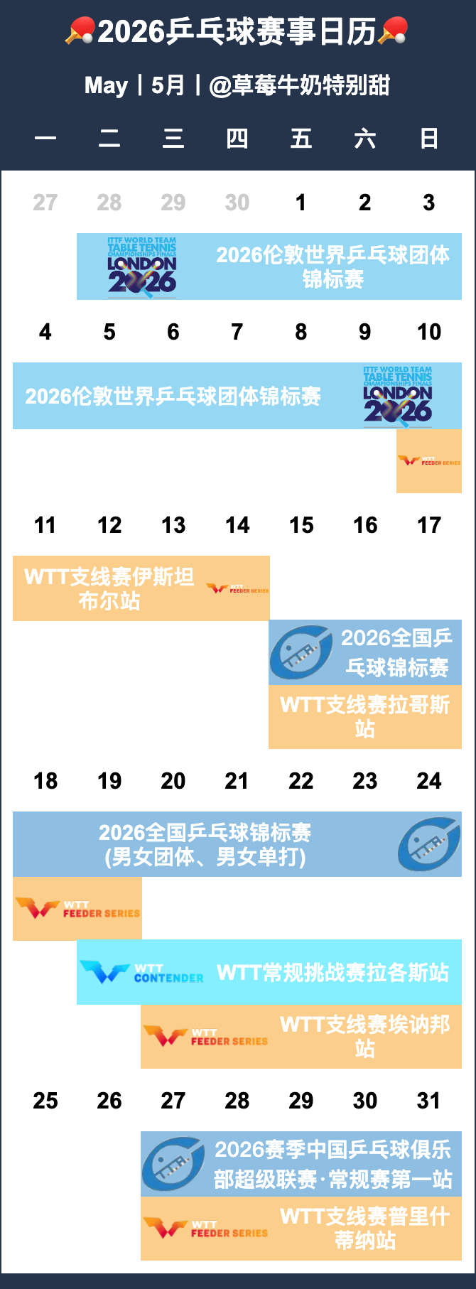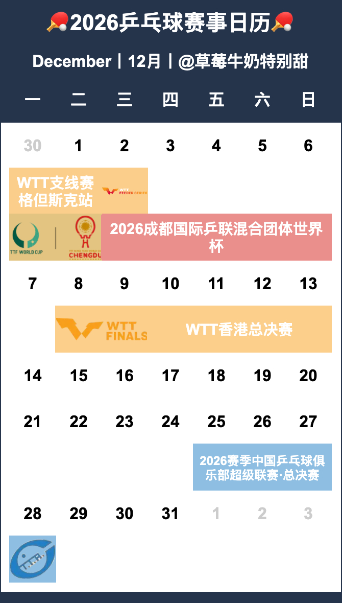 2026年全国乒乓球锦标赛、中国乒乓球俱乐部超级联赛分布月份