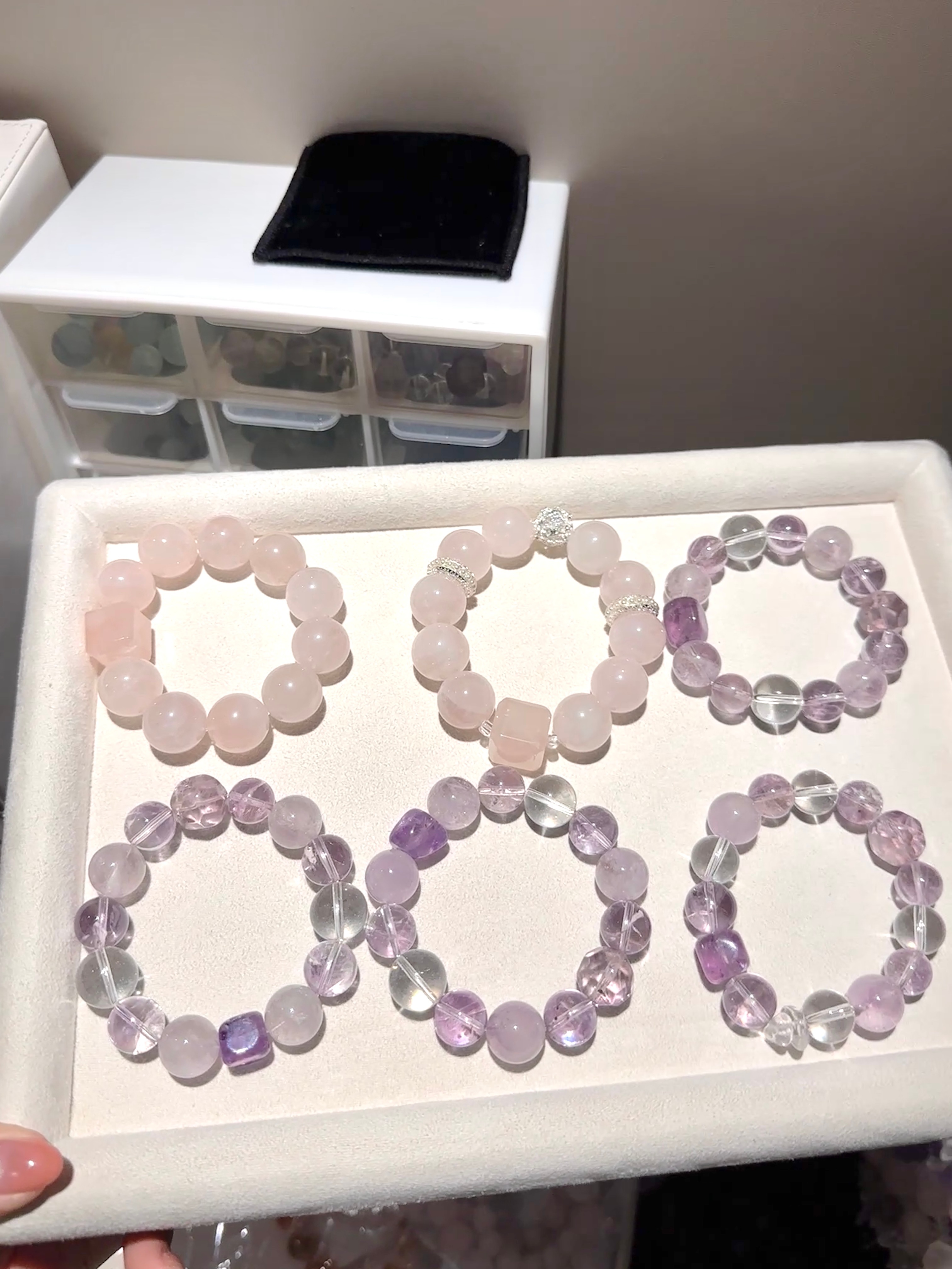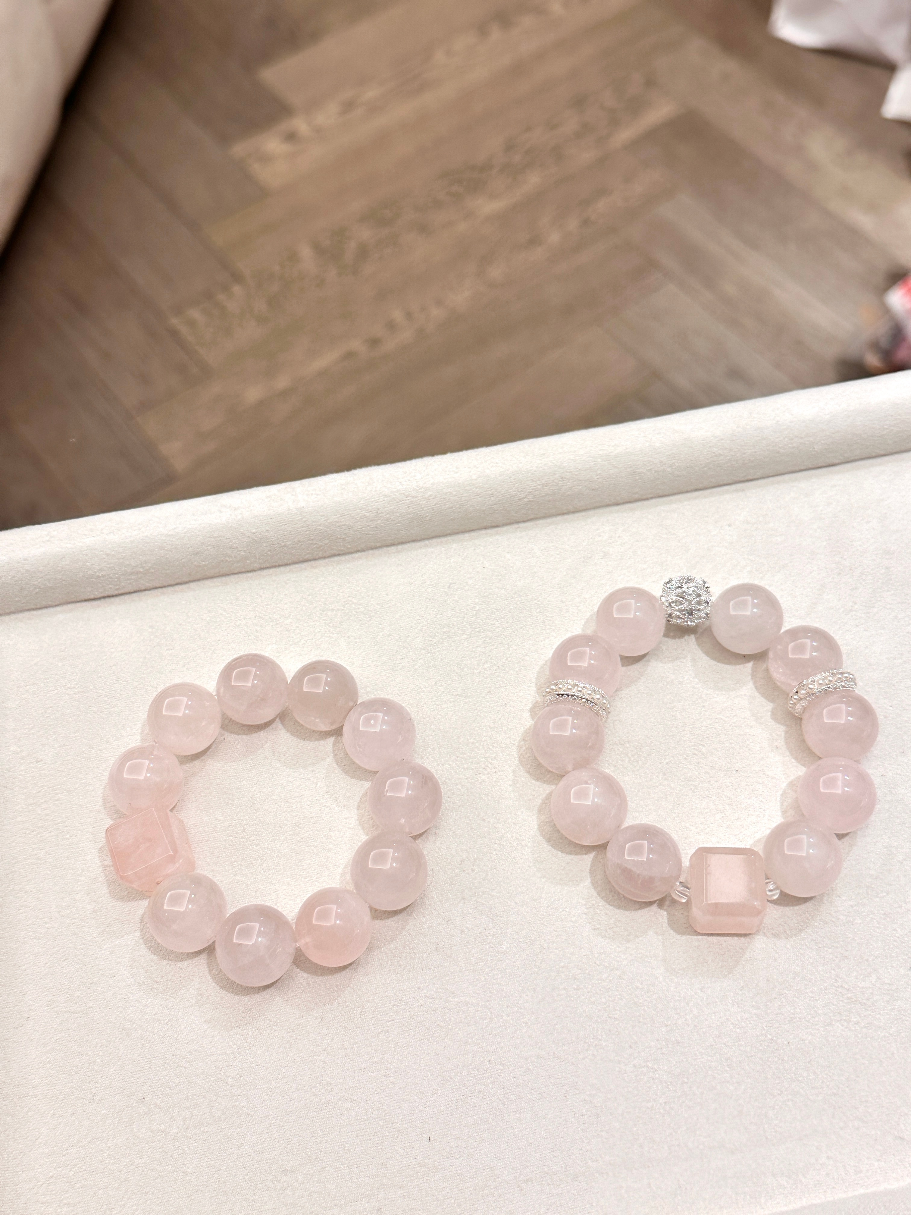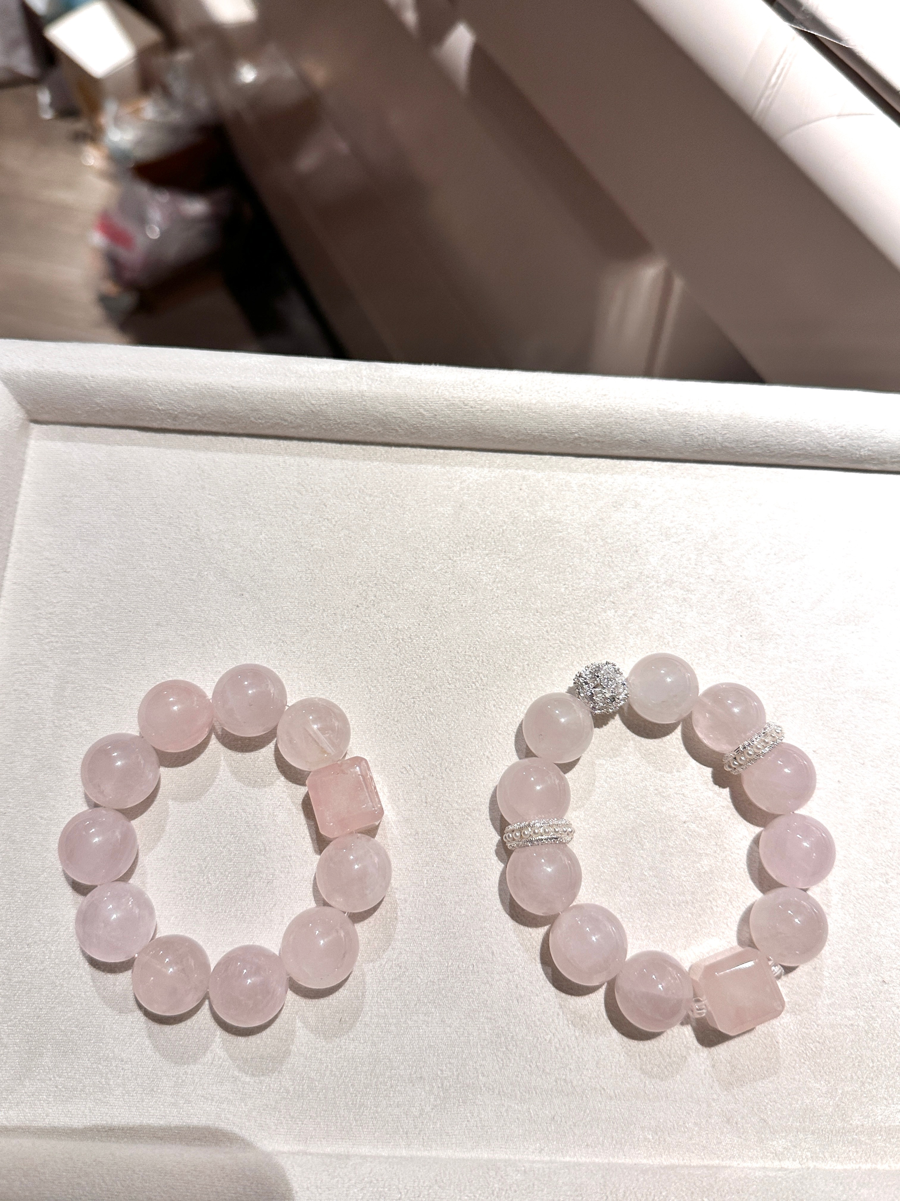 今天做的手串 你们觉得p1的粉色手串加配饰还是不加好呢(顶光和自然光下的样子)