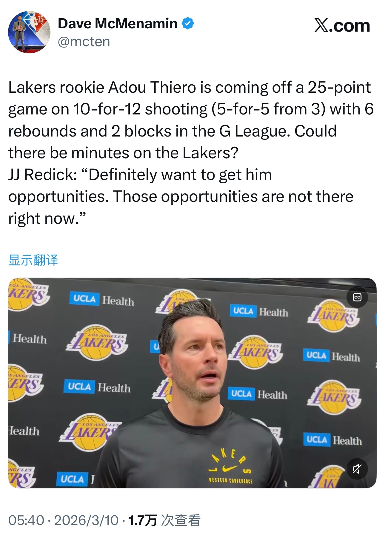 雷迪克今天接受采访,谈到了昨天在发展联盟表现出色,砍下25分6篮板2盖帽的蒂耶罗时表示:“我肯定想给他更多机会,但目前还没有这样的机会。”
