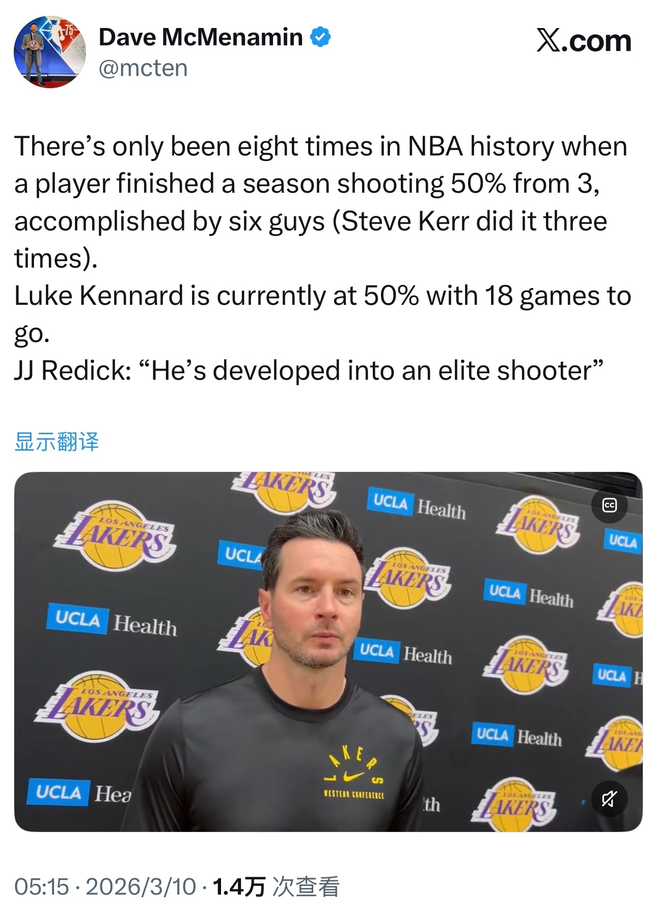 NBA历史上单赛季三分命中率达到50%的情况只出现过8次,由6位球员完成(史蒂夫·科尔一人就做到了3次)。肯纳德目前的三分命中率正好是50%,常规赛还剩18场比赛。雷迪克说:“卢克已经成长为了一名精英级别射手。”