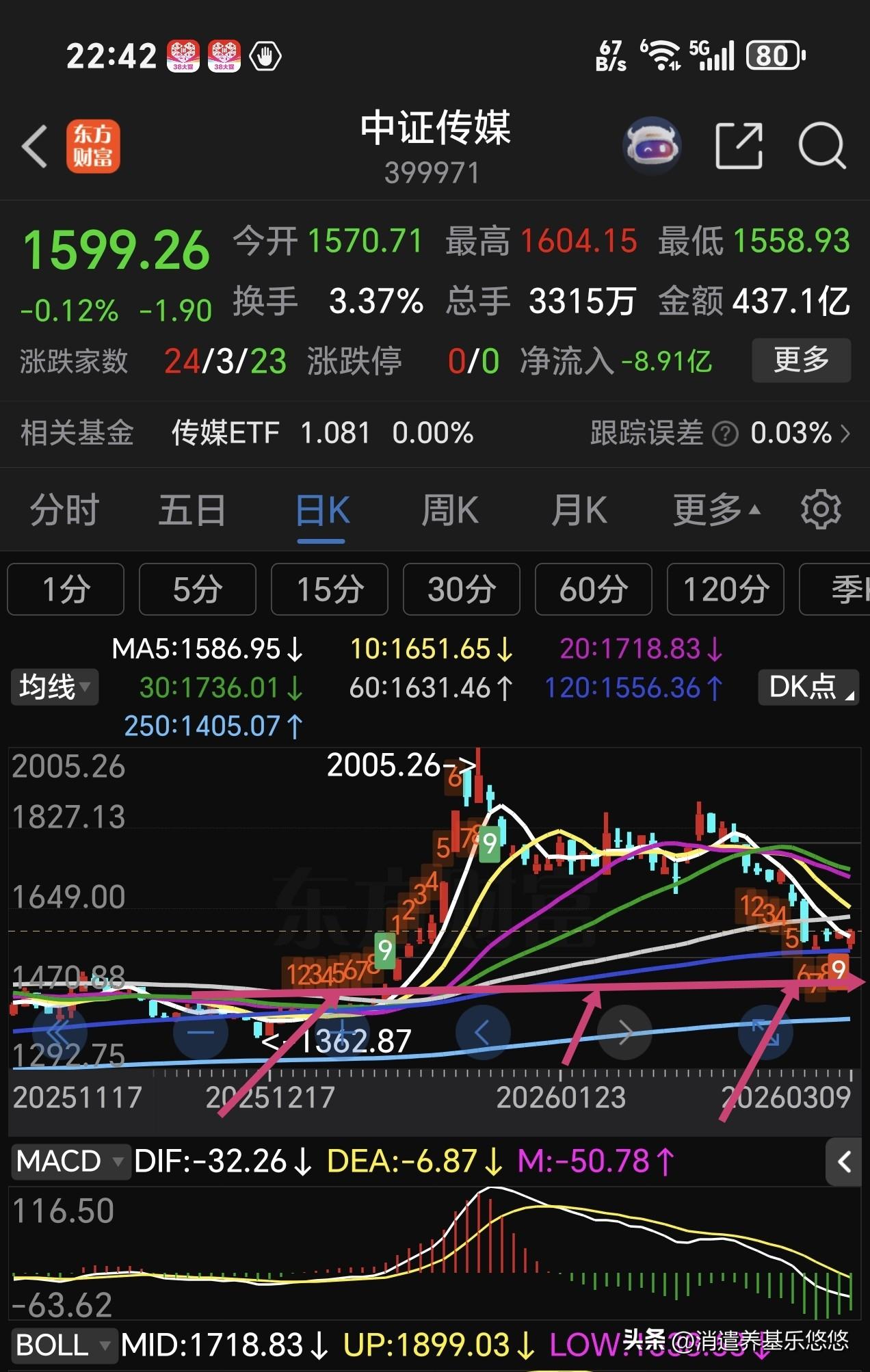 上证指数周一收了一个大长腿,回踩了60日线支撑不破,与上周三低点形成一个小双底,但是周线已经跌破了5--10周线支撑,是否止跌企稳还不能确定。 创业板指数回踩了半年线支撑,周线回踩了30周线支撑,5月线跌破,有点难看,看周二反弹力度,还是谨慎小心一点好。 恒生A股电网设备指数也不错,与中证电网设备趋势比不多,上行中,板块资金流入比较多,继续看涨,逢跌加入或者强行介入均可。 中证传媒指数再跌5--7%就可以抄底介入,现在可以分期低吸布局。 光伏日线周线都处于上涨通道中,日线横盘震荡整理,周线受年线压制,周线突破这个压制将一马平川,目前正在震荡蓄势,可继续持仓待涨,最近它涨多跌破少,这样的市场,不亏就是赚。 ​ 创新药板块日线级别处于短期下跌通道中,近期涨跌都没有改变日线下跌趋势,想进场的人还需要耐心等待。 ​ 脑机接口目前处于日线级别的短期下跌通道中,介入时机未到也是需要等待,等待它突破日线下跌趋势。