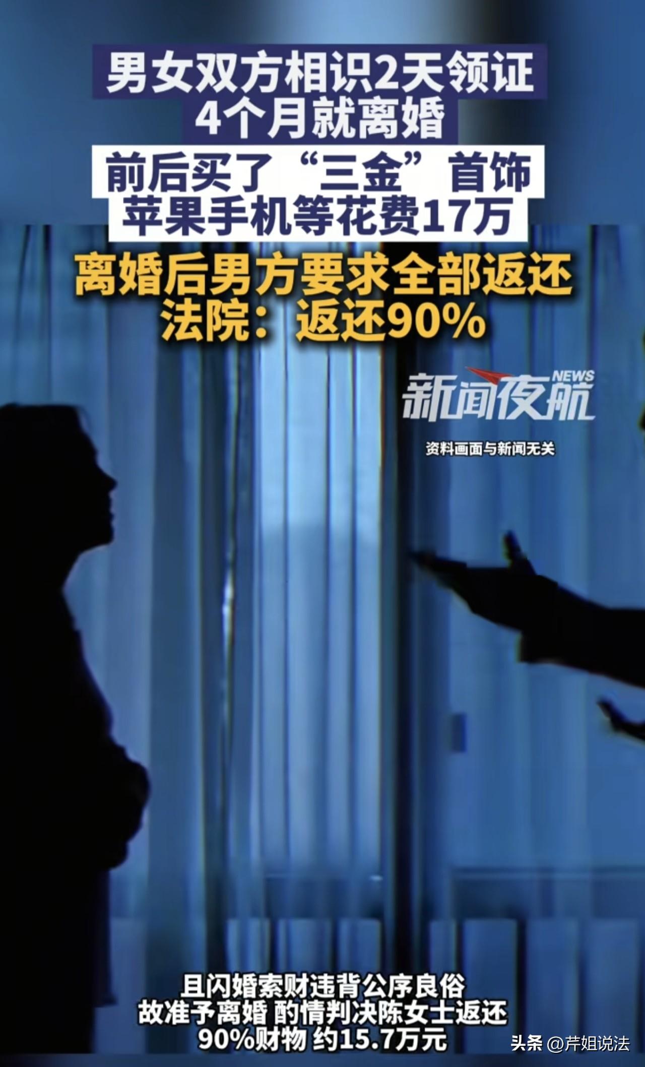 四川简阳,王先生和陈女士通过婚介介绍相亲,相识2天就闪婚。几个月时间里,王先生为陈女士花了17万元多,包括结婚时价值6万元的三金,1部一万多的手机,以及给她的各种转账。可不想仅仅过了四个月,两人的婚姻就走到了尽头。王先生越想越后悔,难道自己真金白银花下来,要维持的就是这样一段婚姻吗?太不值了! 2025年8月,单身的王先生,想要为自己找一个伴侣,于是在婚介所报了名。 婚介按照他的要求安排了陈女士和他认识,他对陈女士一见倾心,他觉得陈女士长得又漂亮又温柔,正是他想要找的结婚对象。 婚介看出了王先生的满意,他们建议王先生对待女生要大方,不能在金钱方面吝啬,而且建议王先生早结婚,早放心。 他们说,陈女士是他们所里的优质女性,如果王先生不和她尽快定下来的话,说不定哪天陈女士就和别人看对眼了。他们还告诉王先生陈女士对他也很满意。 王先生把他们所说的闪婚好处多的言论听进去了,他和陈女士商量了一下后,和陈女士达成了闪婚的共识,相约两天后就去把结婚证给办了。 当时的王先生认同婚介所“感情不重要,两个人合适才重要,尽快结婚,定下来,婚后一样可以把感情培养得很好,两人做一对甜甜蜜蜜的小夫妻,羡煞旁人”的言论。 可结婚后,王先生才发现,先婚后爱的剧情只是想象,自己的婚姻是一地鸡毛。 他们婚后聚少离多,因为了解不透彻而引发的各种矛盾也开始爆发,王先生起初尝试磨合,最终,王先生终于发现,自己和陈女士压根不合适。 2025年11月,两人就彻底分居了,他们的婚姻彻底破裂,这距离他们认识仅仅过去了四个月。 分居后,王先生一个人躺在空荡荡的房间里睡不着,那个卧室是他精心布置过的婚房,他以为他和陈女士会恩恩爱爱,白头到老。 因此,他平时愿意给陈女士花钱,他图的就是一段稳定而又幸福的婚姻啊! 他拿起手机仔细一算才发现,仅仅四个月的时间,自己就给陈女士花费了17万多,几乎相当于很多人的年薪了。 包括了一部1万多的手机,结婚时买的价值6万元的三金以及给她的各种转账。 那几天他每天都辗转反侧,他反复问自己,花这么多钱换来一个这样的婚姻,这值得吗?真金白银地砸下去,难道自己只能得到这样的结果吗? 王先生越想,心底那道不值得声音就越来越大,于是他提起了诉讼,要求和陈女士离婚,并让陈女士退还他的全部财物。 最终,经过调查审理,判决陈女士退还王先生财物的90%,即15.7万元。 为什么陈女士和王先生已经结婚,最后还会判决返还彩礼,而且返还90%呢? 《民法典》第一千零七十九条规定,人民法院审理离婚案件,应当进行调解;如果感情确已破裂,调解无效的,应当准予离婚。 王先生和陈女士仅仅相识两天就结婚,他们婚前缺乏了解,没有感情,婚后也聚少离多,矛盾众多,没有建立起良好的夫妻关系。 并且,他们的婚姻受到婚介所的引导,双方还试图用高额的财物维持关系。 因此他们的婚姻与以感情为核心的婚姻不一样,有违公序良俗,根据该法条,最终才会判决二人离婚。 《最高法关于审理涉彩礼纠纷案件适用法律若干问题的规定》第二条规定,禁止借婚姻索取财物。一方以彩礼为名借婚姻索取财物,另一方要求返还的,人民法院应予支持。 根据该法条,陈女士应该返还王先生的财物,但考虑到公平原则,陈女士和王先生结婚了四个月,虽然没有稳定的共同生活,但还是在一起生活过,所以最终要求陈女士返还王先生90%的财物。 来源:大象新闻,新闻夜航