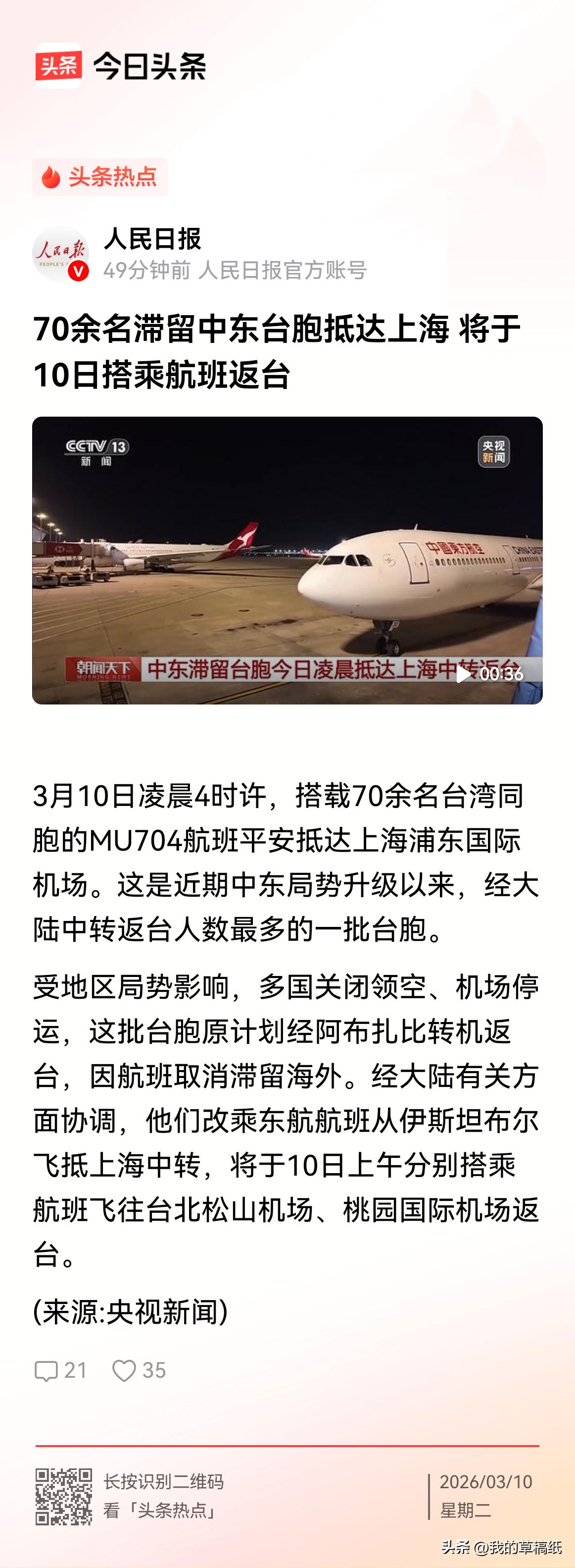 70多名滞留中东的台胞己抵达上海,今天转机回家! 刚看到这个消息,凌晨4点,70多名台湾同胞乘坐MU704航班抵达上海浦东机场。 说实话,我第一反应是:这些同胞在国外得多绝望啊? 中东局势一紧张,领空关闭、机场停运,原本要从阿布扎比转机回台湾的计划全泡汤了。人在异国他乡,航班说没就没,那种无助感真的难以想象。 还好,大陆这边协调了东航,专程把他们从伊斯坦布尔接回上海中转。今天上午,他们就能飞回台北松山机场和桃园机场了。 有意思的是评论区:“台湾同胞一定要反对祖国分裂,不管你们身处何境,强大的祖国是你们强大的后盾。” 这话扎心但真实。关键时刻,是谁出手相帮?是谁能让他们平安回家? 你觉得,遇到海外突发状况时,“祖国”这两个字意味着什么?