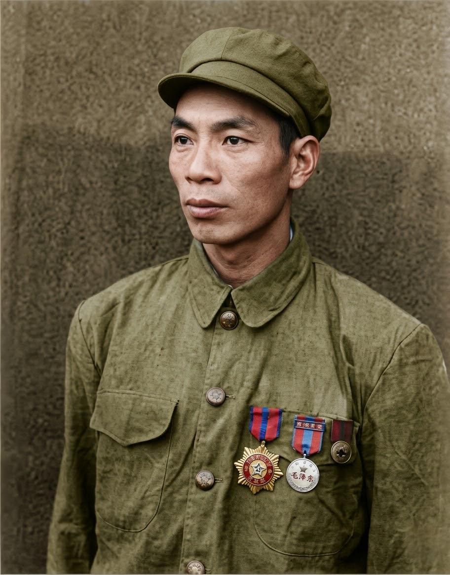 这张照片中的是新中国第一位特等功臣、特级战斗英雄杨根思,这张照片拍摄于1950年9月,是他在北京参加全国战斗英雄代表大会时的留影。 杨根思,身着中国人民解放军军装,胸前佩戴着多枚战斗英雄勋章,这是对他在抗日战争和解放战争中赫赫战功的最高褒奖。 在解放战争中,杨根思凭借过人的胆识和爆破技术,多次炸毁敌人碉堡,被誉为“爆破大王”,并荣获“华东一级战斗英雄”等称号。 1950年11月,在抗美援朝战争第二次战役的长津湖战斗中,杨根思奉命率一个排扼守1071.1高地东南侧的小高岭,负责切断美军王牌陆战一师的南逃退路。在打退敌人8次进攻、阵地上只剩他一人时,他毅然抱起炸药包,冲向敌群,与敌人同归于尽,年仅28岁。