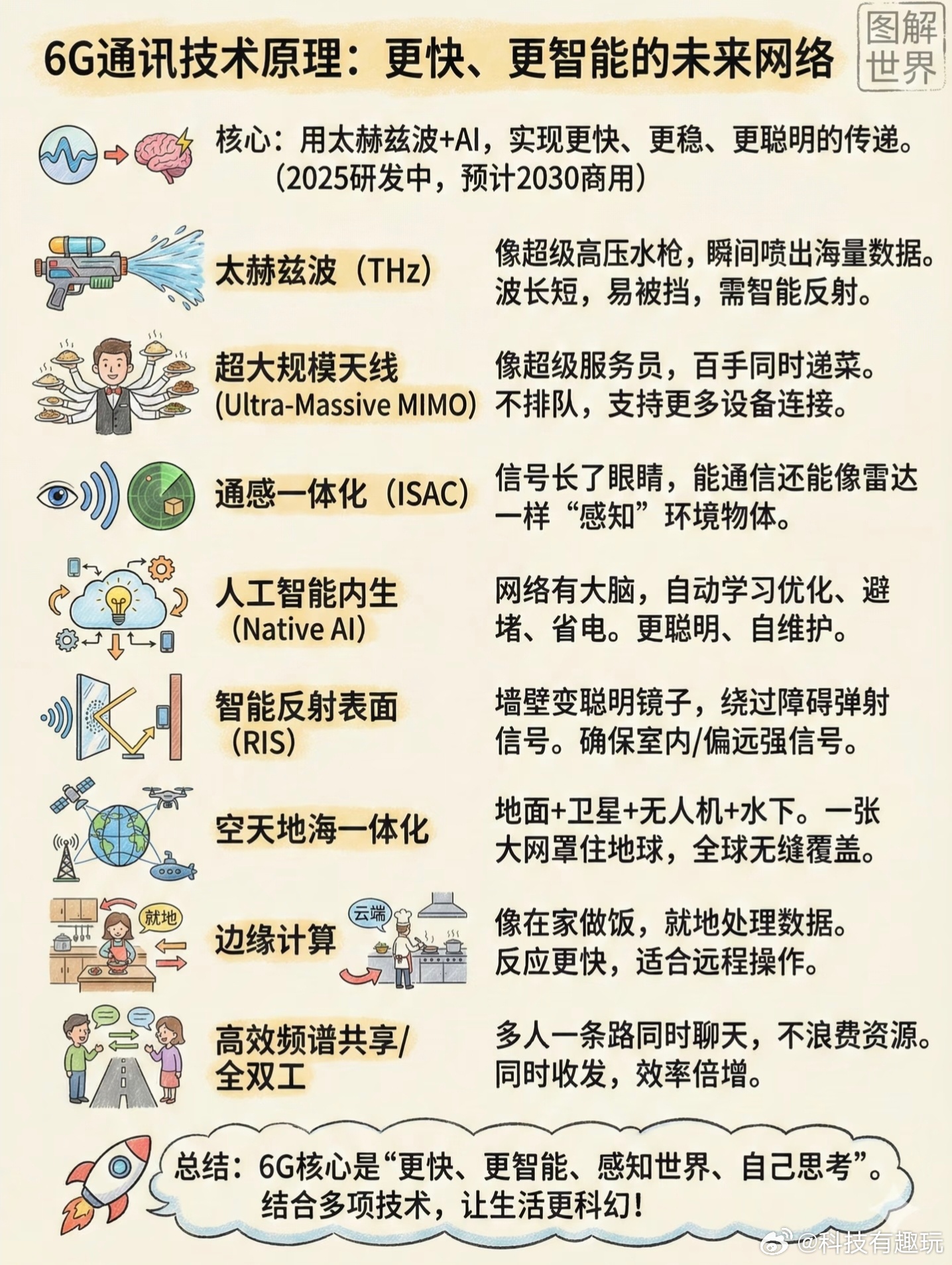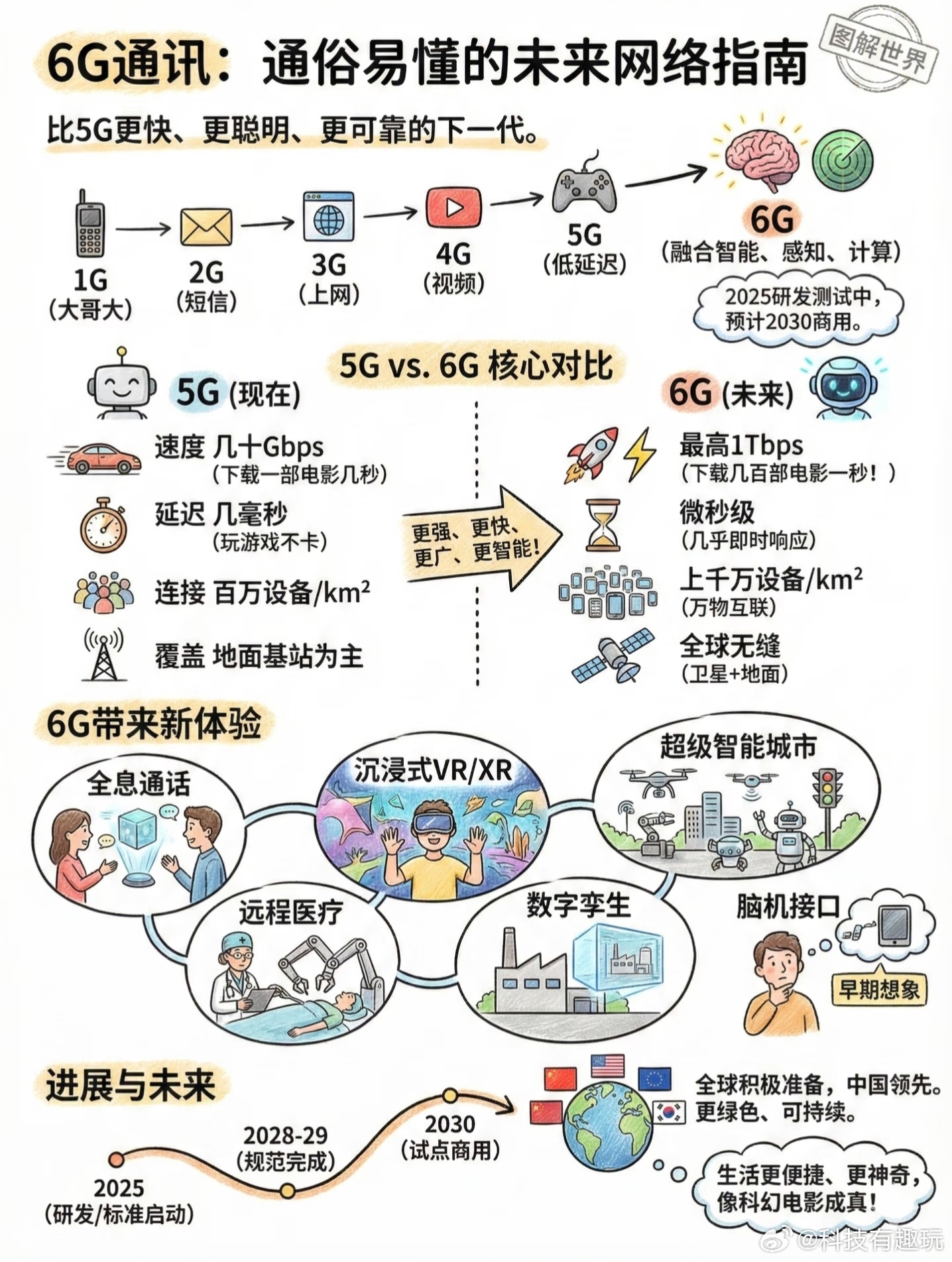 6G网要来了相比于5G来说,6G的峰值传输速度可以达到100Gbps-1Tbps,下载一部高清电影可能只需要几秒,还有微秒级时延、空天地一体覆盖、AI原生通信,从高速上网到万物智联,真正的下一代数字世界或许就要来了