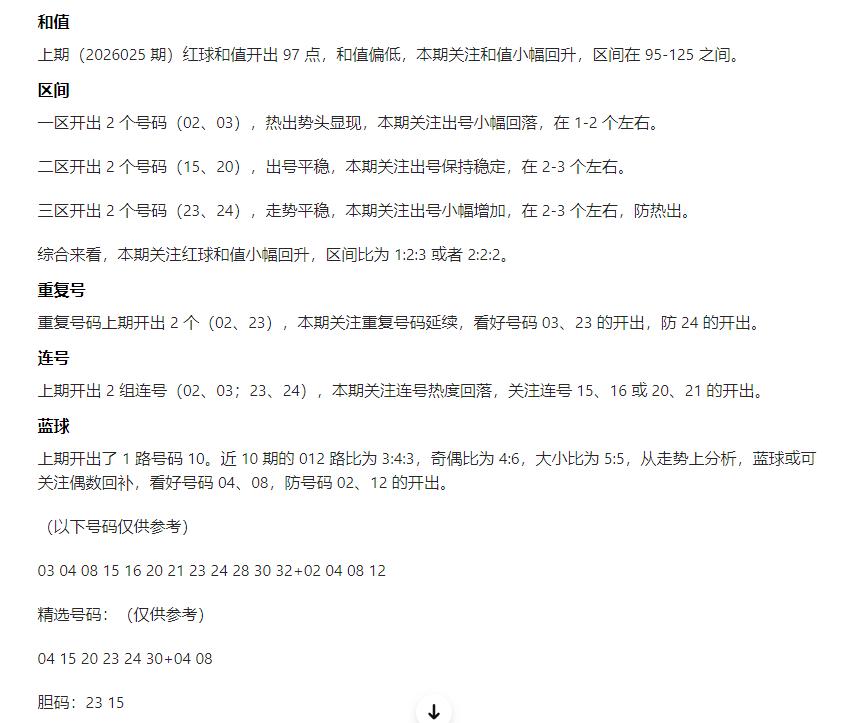 AI辛丹丹来啦!这次是智能体预测并非本人:蓝球02 04 08 12清一色全偶号,位置从小号到中大号不固定,02 04都是近期刚开出过的号码,08 12则围绕上期10附近,整体看不出是明显追冷还是追热。红球双胆15 23选择大胆,尤其23已经是4期重号,上期ai智能体就是命中23连开没想到这次居然又单挑5期重号,看来ai的思路很是简单粗暴只追热号啊!