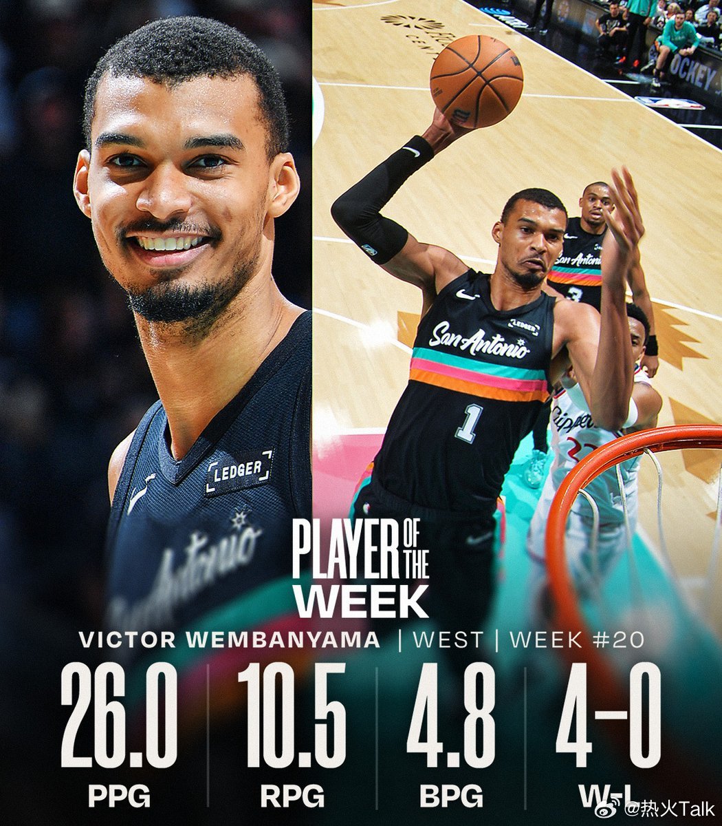 东部周最佳:泰勒希罗🔥西部周最佳:文班亚马🦄