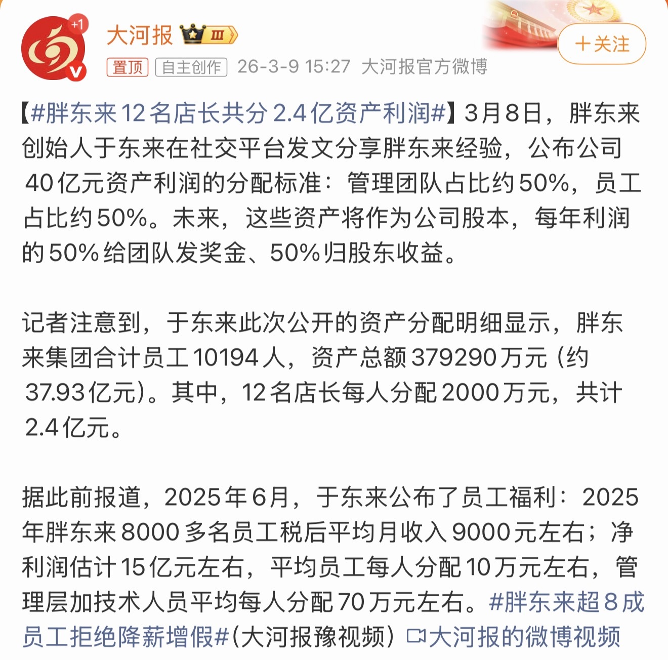 胖东来12名店长共分2.4亿资产利润知道胖东来福利好,没想到这么好,店长2000