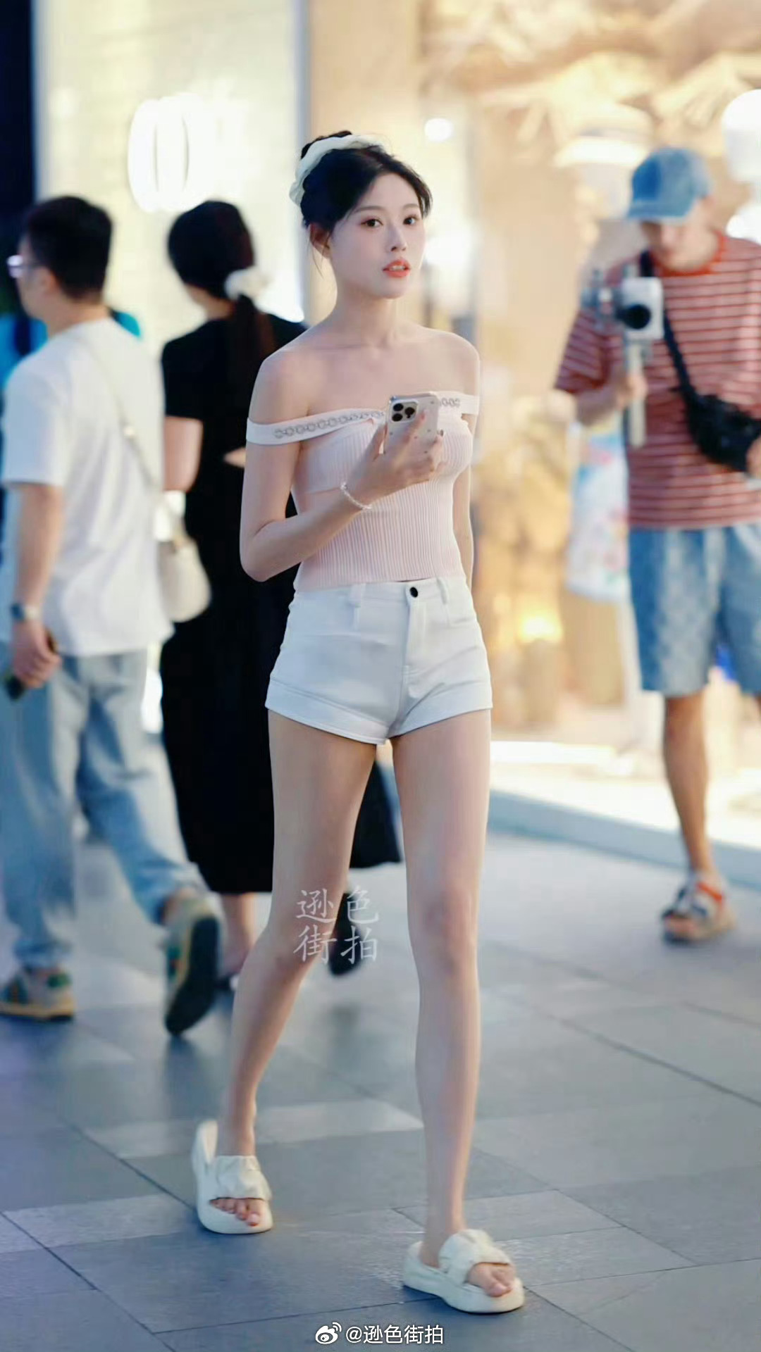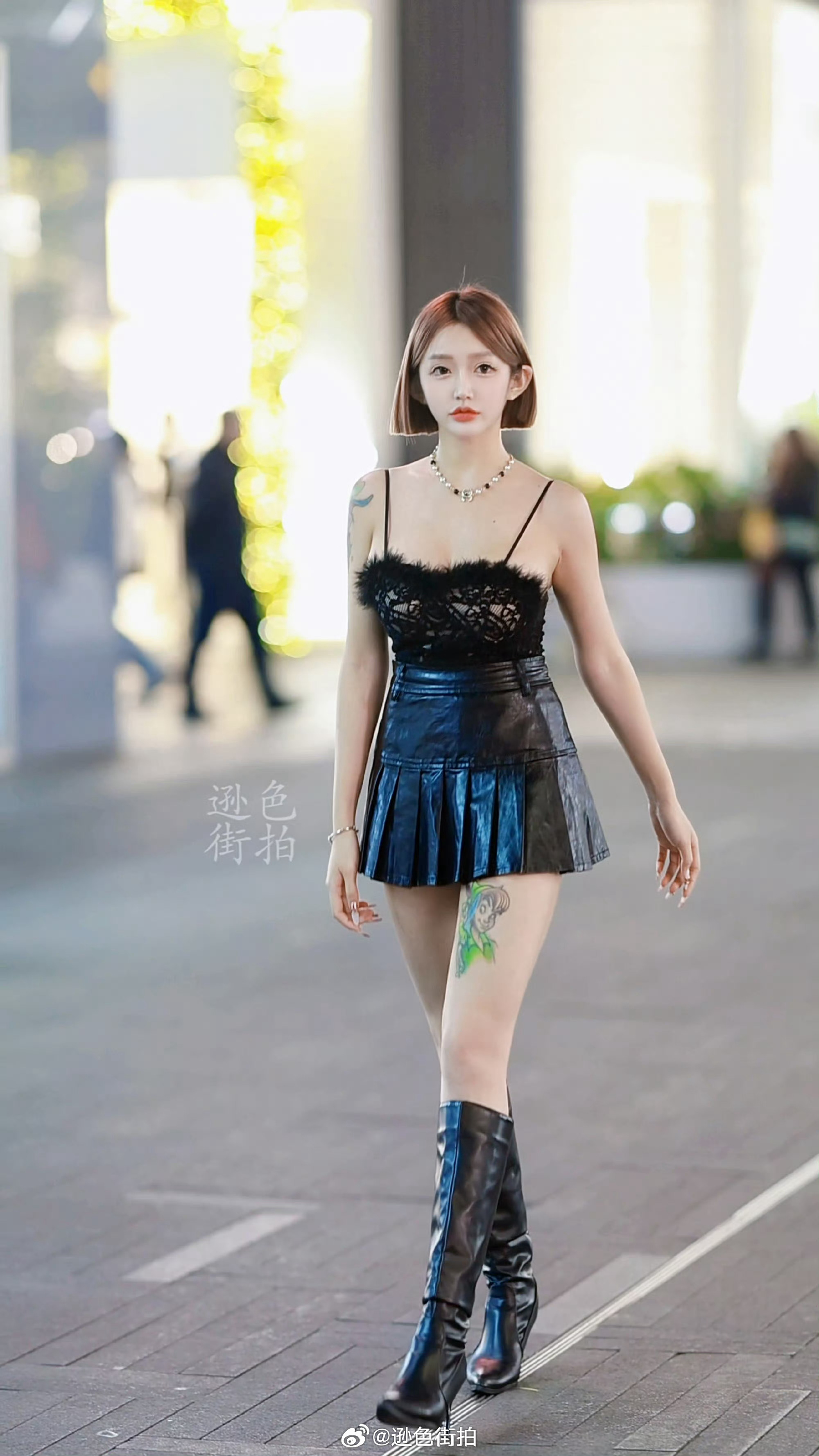 夜晚街拍,时尚少女穿搭,白色蕾丝背心搭配黑白丝巾,气质满分!🌃👗💄