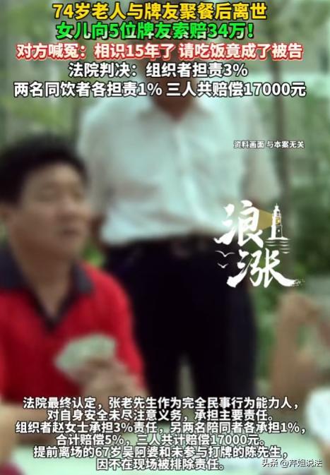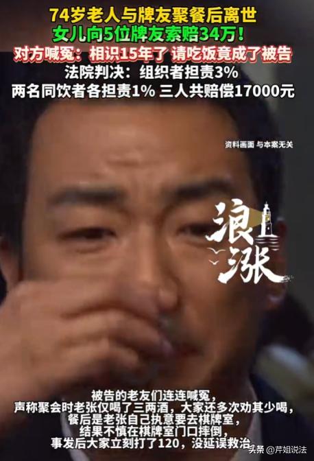上海,74岁老汉与相识15年的5位牌友聚餐,席间共饮一瓶白酒。饭后老汉执意去棋牌室,却在门口摔倒,经抢救无效离世。老汉女儿认为牌友未尽照顾义务,将他们告上法庭索赔34万。牌友们满心委屈,称自己好心招待。法院调查发现聚会组织者连老汉家庭住址都不清楚,同行几人未尽看护责任。最终法院判决聚会组织者及两名一同前往棋牌室的老人承担一定赔偿责任,其余人无需担责。 好好的老友相聚,最后闹成这样。 这事发生在2024年3月,74岁的张先生,特意跑到奉贤去看那几个认识了15年的牌友,都是老熟人了,平时就爱凑一起打牌聊天。 其中有个赵女士,特别热情,一看老张来了,直接设宴招待,几个人围坐一桌,边吃边唠家常,不知不觉就喝了一瓶白酒。 本来吃吃喝喝挺开心的,结果酒足饭饱之后,老张不知道哪来的劲头,非要跟着大家一起去棋牌室,拦都拦不住。 谁也没料到,刚到棋牌室门口,老张就脚步踉跄,身子一歪直接摔倒了,当场就没了意识,几个人吓得魂都没了。 同行的人反应还算快,赶紧打了救护车,火急火燎把老张送进医院,可最终还是没能救回来,医生说是急性硬膜下血肿,没保住性命。 老张的女儿得知消息后,整个人都崩溃了,思来想去,觉得父亲的死,牌友们脱不了干系,认为他们没尽到照顾义务。 二话不说,就把那5位牌友全都告上了法庭,一开口就索赔34万,这数字一出,牌友们彻底懵了。 他们觉得自己太冤了,本来是好心招待老朋友,没想着要图什么,结果现在反倒成了被告,怎么想都想不通。 这事拖了快两年,直到2026年3月9日,上海奉贤法院的一纸判决,才算是给这场悲剧,画上了句号。 法院调查时,查出了一个关键问题,作为聚会组织者的赵女士,居然连老张的家庭住址都不知道,更别说了解他的身体状况了。 而且那天饭后,跟着老张一起去棋牌室的几个人,也确实没尽到看护责任,明知道他喝了酒,脚步不稳,也没多留意,才导致了意外发生。 牌友们只是一起吃个饭,真的要担责任吗? 银行《民法典》第1165条规定,行为人因过错侵害他人民事权益造成损害的,应当承担侵权责任。 还有第1198条,群众性活动的组织者,未尽到安全保障义务,造成他人损害的,应当承担侵权责任。 赵女士作为聚会组织者,没了解老张的基本情况,没尽到合理的安全保障义务,这就是过错。 另外两个跟着去棋牌室的人,明知老张饮酒后行动不便,未履行看护义务,也存在过错。 有人觉得“好心招待”就不用担责,这是误区。 共同饮酒后,同饮者尤其是组织者,就有了附随的看护、劝阻义务,不是光好心就行。 不是所有同饮者都要担责,本案中其余3位牌友,没有参与后续前往棋牌室的行为,也没有过错,所以法院判他们无需担责,这体现了法律的公平,不搞“连坐”。 老张作为完全民事行为能力人,自己执意要去棋牌室,对自身安全未尽到注意义务,其实才是悲剧发生的主要原因。 15年的老友情谊,终究抵不过一场意外,可法律不讲情谊,只讲过错,好心不能替代法律义务,再熟的人,喝酒聚会也要尽到本分。 很多人聚会喝酒总抱有侥幸心理,觉得“喝一点没事”“他自己要喝的,跟我没关系”。 殊不知,一旦出了意外,这些借口都没用,法律只看你有没有尽到该尽的责任。 老张女儿索赔34万,心情可以理解,但法律讲究证据和过错,不是亲人离世,就能随意索赔,合理维权才是正道。 最终,法院判决:聚会组织者赵女士,以及两名一同前往棋牌室的老人,承担相应赔偿责任,三人合计赔偿17000元,其余3位牌友无需承担任何责任。 一场老友相聚,最终落得人财两空、情谊破裂的结局,实在令人惋惜。 大家觉得,这个判决合理吗?牌友们真的该担责吗?快来评论区说说你的看法~