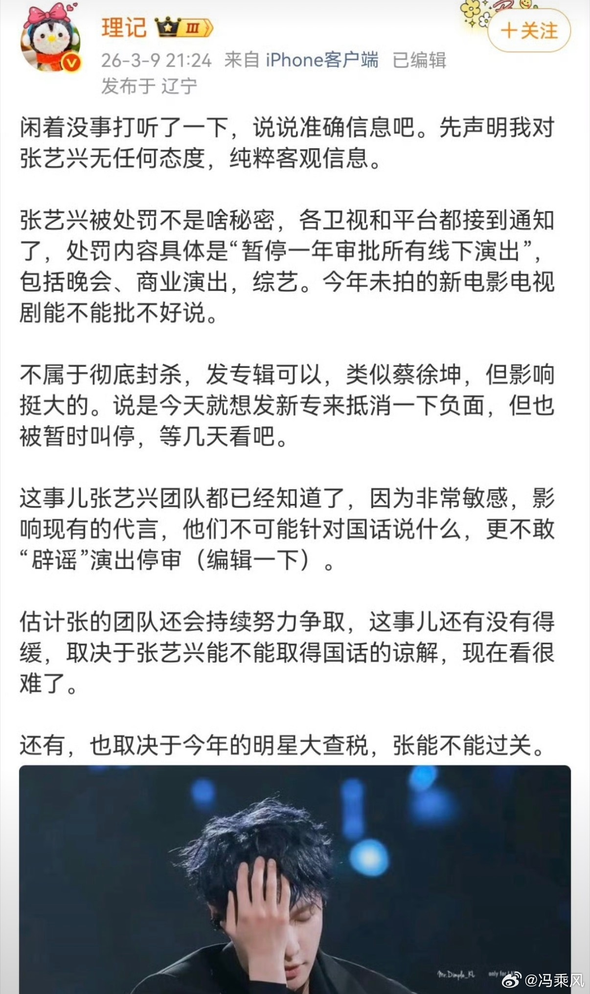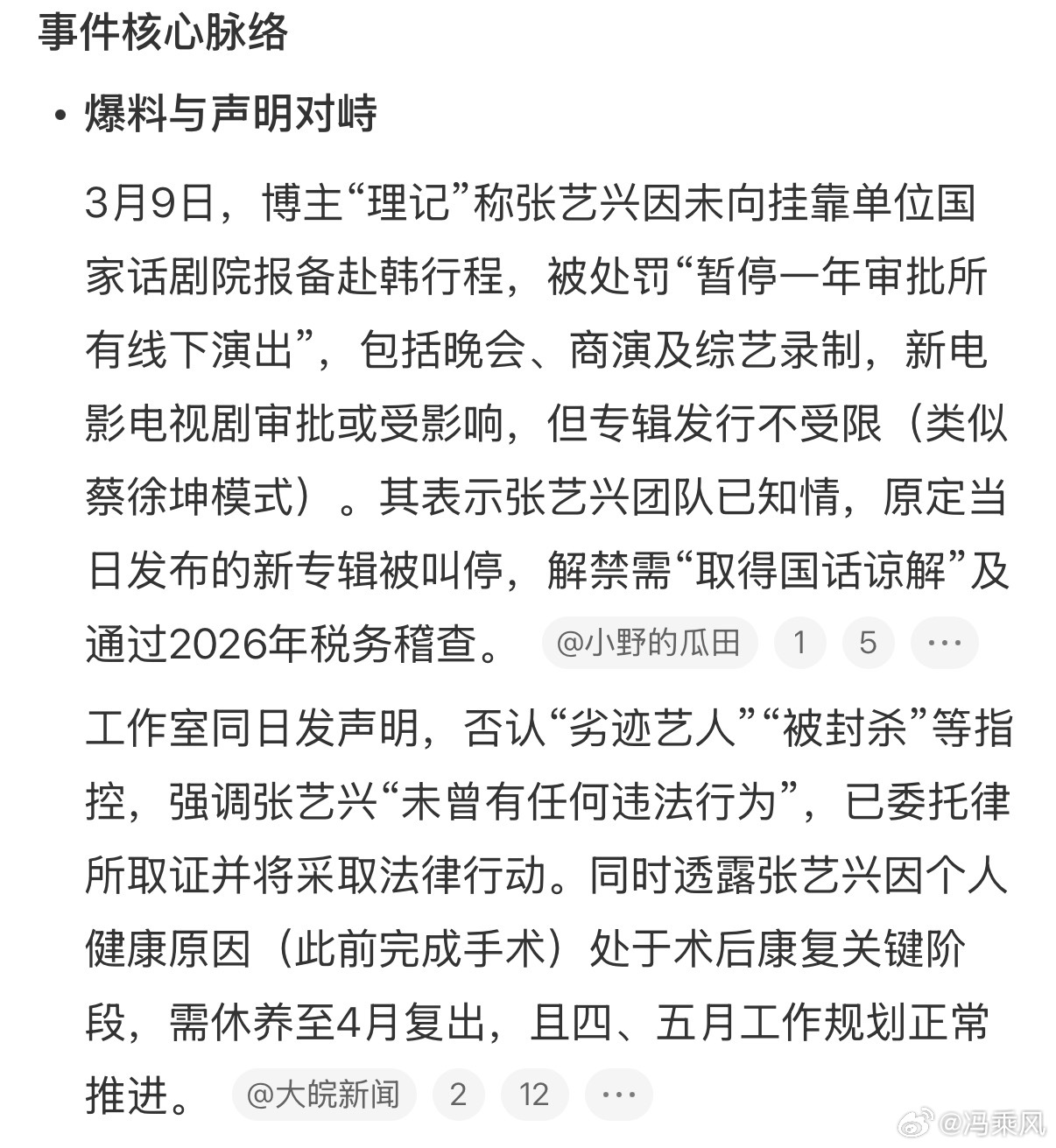 终于理清楚脉络了,确实记得有这么个事儿,没想到这么严重。按道理这个事儿的处理应该问问他师傅黄磊,老狐狸和小狐狸的搭档不至于处理的这么差,年初的张艺兴改编的大花轿还在脑海里回荡,希望妥善处理早日解决创作更好好作品吧。理记硬刚张艺兴工作室声明