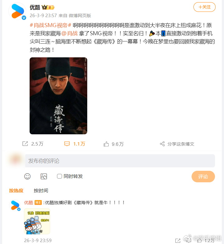 优酷SMG最大赢家优酷真是好命,独播剧《藏海传》男主肖战获得SMG视帝,《蛮好的