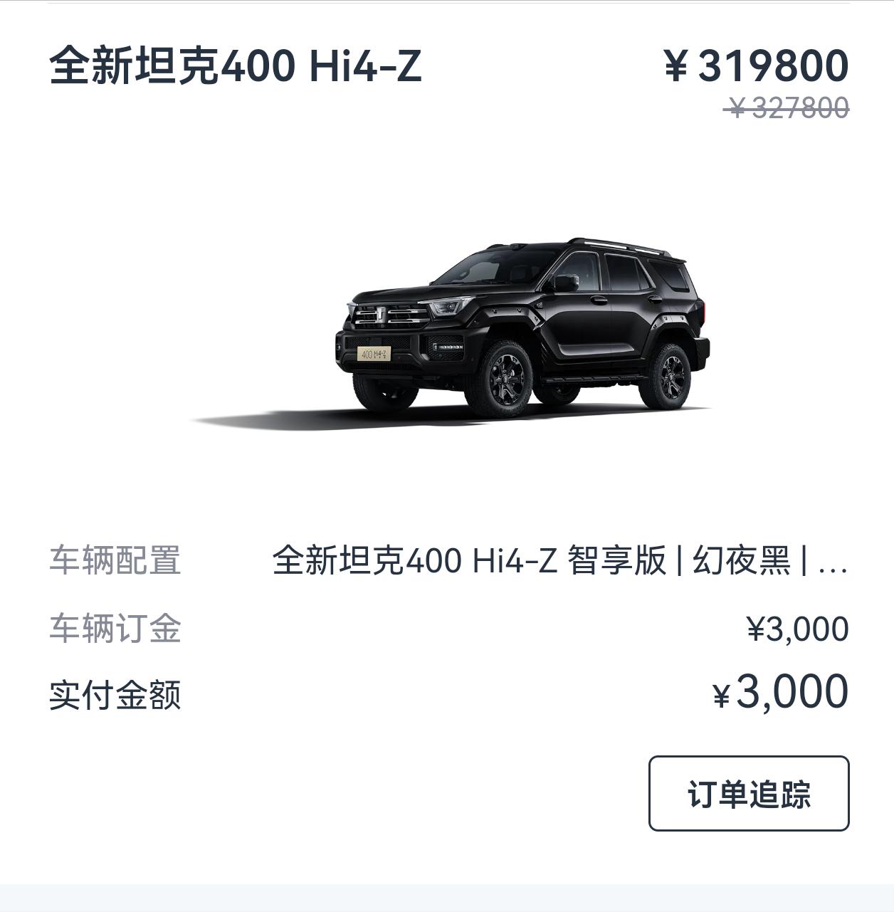兄弟们,我订车了!坦克400 Hi4-Z! 30万级智能硬派越野,到底值不值? 刚付完订金,热乎的订单截图奉上! 全新坦克400 Hi4-Z智享版,幻夜黑,已排产中。 作为汽车博主,天天给别人推荐车, 这次轮到自己掏钱,说说为什么选它: 1. 200km纯电续航,刚好符合我的用车场景! 日常通勤一周一充,偶尔出去玩或者回老家,综合续航不焦虑。 升级了AY胎和夜视红外摄像头,出去浪也踏实。 2. 颜值即正义,外观很对我胃口! 幻夜黑+机甲风,路上能撞衫的概率极低。 个人比较喜欢400的外观,这个是仁者见仁智者见智。 3. 价格还能接受,在预算范围内! 30万出头的价格,只能硬派越野,能选的不多。 也就方程豹豹5和猛士817可选, 对比以后,还是400的外观更吸引我! 4S店说大概10天左右提车, 后续提车、实测都会发出来,和车友们分享! 有江苏南京的400群也麻烦推荐, 可以组队一起玩! 新手上路,定期更新! 劳烦关注,一定回关!
