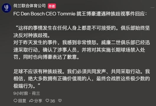 威廉二世球迷种族歧视被长期禁入球场,那皇家马德里球员赫伊森种族歧视为什么会不了了之呢? 荷乙联赛第30轮邓伯什对阵威廉二世,效力于邓伯什的留洋小将王博豪被看台上的球迷做出“拉眼角”这一明显有种族歧视的动作。 比赛结束不久,对手威廉二世俱乐部立即联系邓伯什俱乐部及王博豪本人,做出道歉的同时并且对涉事球迷做出长期禁入球场的处罚。 与邓伯什俱乐部做法形成鲜明对比的是西甲豪门皇家马德里,队内球员赫伊森明目张胆种族歧视已经过去很久了,皇家马德里却没有做出任何道歉,也没有对赫伊森做出任何处罚。 同样是种族歧视,为什么两支俱乐部却会做出截然不同的反应呢? 这是不是值得我们所有中国人深思呢?