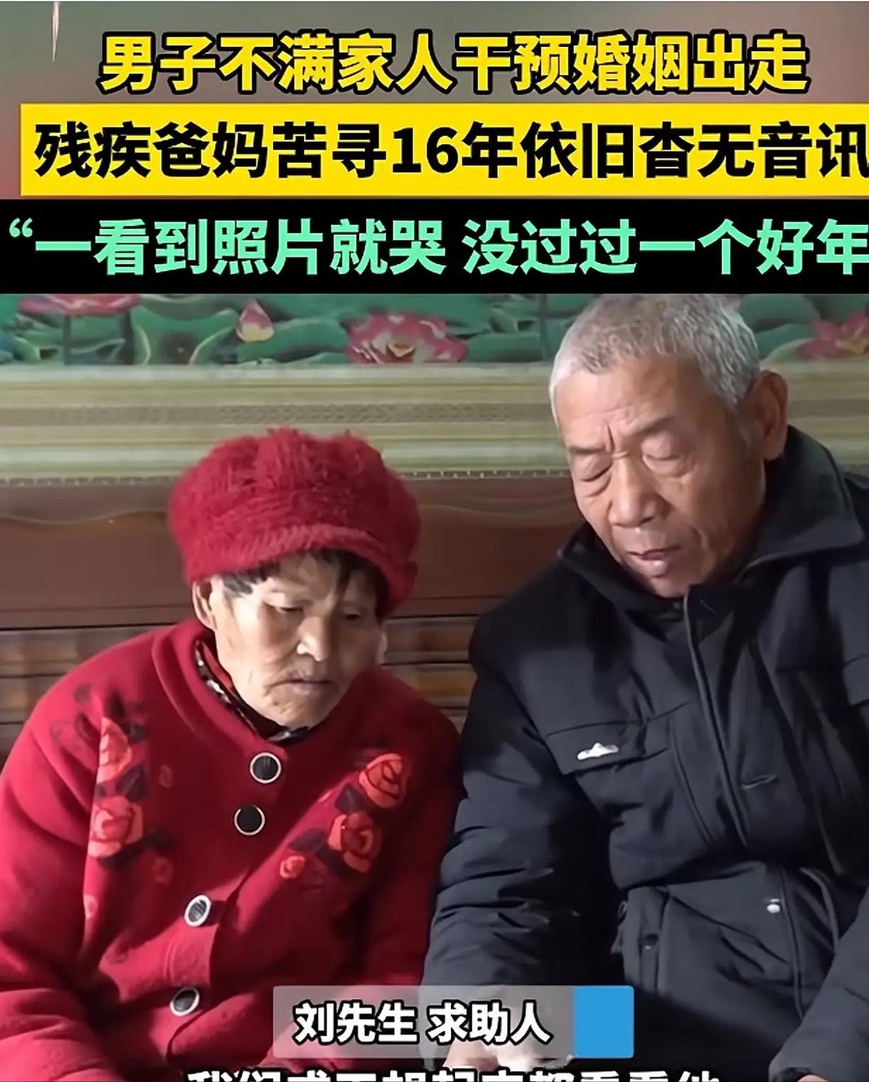 早知今日,何必当初!”河南郑州,20岁小伙处了个对象,小伙父母嫌弃女孩家太远,硬是棒打鸳鸯,将二人拆散了。小伙对父母心生怨恨,一气之下离家出走,这一走就是16年,从此杳无音讯。如今,其父母已经60多岁,双双身患残疾,他们思儿心切,常常拿着儿子的照片泪流不止,母亲眼睛已经哭成半瞎。邻居说:16年里,他们老两口吃饭都含着眼泪,日夜思念,太悲惨了!网友:这是老了,想儿子了!如果不是老了,身体不好了,还是不会想儿子。 今年60多岁的刘大爷和老伴,双双身患残疾,日子捉襟见肘,只能靠低保勉强维持生计。 刘大爷腿脚不便,走路身子不停打晃,每一步都格外吃力; 老伴则因常年思儿落泪,视力急剧下降至半瞎,平日里只能摸索着做家务,手里那两张被摩挲发皱的儿子相片和社保卡,是她唯一的慰藉,也是儿子离家后留下的仅存念想。 16年来,他们从未过过舒心年,别人家团圆热闹时,他们家只有空荡荡的屋子和无尽思念。 吃饭时,老两口常常吃着吃着就红了眼眶,眼泪掉进碗里,再香的饭菜也难以下咽。 屋里当年为儿子准备的婚房家具,如今落满厚尘、结满蛛网,就像他们被搁置16年的牵挂,再无兑现的可能。 为了找儿子,刘大爷拖着残疾的腿,三次辗转上海,只因为儿子发小说过,当年他曾在上海一家饭店做过后厨。 他跑遍上海的居委会、派出所,甚至去血液中心采样入库,用尽所有办法,却始终一无所获,儿子就像人间蒸发般,没有留下丝毫痕迹。 如今的刘大爷,早已没了当年的固执,只剩满脸悔恨,他最大的心愿,不过是再见儿子一面,看看他的模样,不问富贵,不索弥补。 这场跨越16年的分离,要从2010年说起。 那一年,刘大爷的儿子刘好举刚满20岁,刚考完高考,和一位平顶山姑娘情投意合,很快谈婚论嫁,他满心欢喜地规划着和女孩的未来,期盼携手走进婚姻。 刘大爷老两口嫌弃女孩家太远,当时从平顶山到郑州坐长途汽车要两个多小时,觉得女孩家不知根知底,日后无照应。 更执着的是,他们想让儿子娶村里一位自己看着顺眼、觉得门当户对的姑娘,完全不顾刘好举的心意。 他们以长辈权威强行干涉,撕毁女孩照片、说着难听话,硬生生拆散这对恋人,逼着刘好举服从自己的安排。 年轻气盛的刘好举满心委屈怨恨,无法理解父母的偏执,和父母激烈争执后,毅然摔门而出。 那时手机未实名制、微信也未出现,刘好举删光所有联系方式,甚至注销老家QQ号,决绝得没有一句告别。 而当时的老两口还心存侥幸,觉得儿子只是一时赌气,迟早会想通回家,坚信自己做的一切都是为了儿子好。 可他们没想到,这一走,就是16年,成了一场永别式的分离。 此事传到网上,很快引发全网热议,网友们各执一词,有人心疼老两口,觉得16年的思念与悔恨,足以抵消部分过错,儿子太过狠心。 也有网友直言,老两口是自食其果,当年强行干涉儿子婚姻,忽视其情感需求,如今老了需要照顾,才想起思念儿子,这份牵挂难免掺杂私心。 刘好举16年杳无音讯、不管父母死活,也不合情理且不合法。 这场悲剧没有赢家,老两口在思念与悔恨中饱受病痛折磨,刘好举漂泊16年,错失亲情,徒留终身遗憾。 很多父母总说“为你好”,却忘了孩子不是附属品,有自己的思想和选择,婚姻爱情从来不是父母可随意干预的。 真正的父爱母爱,从不是强行安排和权威绑架,而是尊重与放手,是在孩子需要时给予支持,选择时给予理解。
