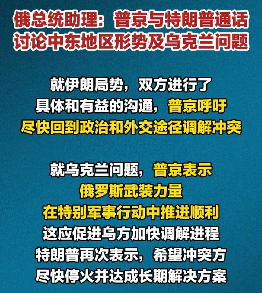 特朗普与普京打电话讨价还价。普京呼吁特朗普在伊朗停战,特朗普希望普京在乌克兰停火。双方明明都是冲突当事方,反过来却要求通过外交途径解决冲突。可见世界就是这么魔幻,哪有什么是非多错,一切还都是为了自己国家利益!