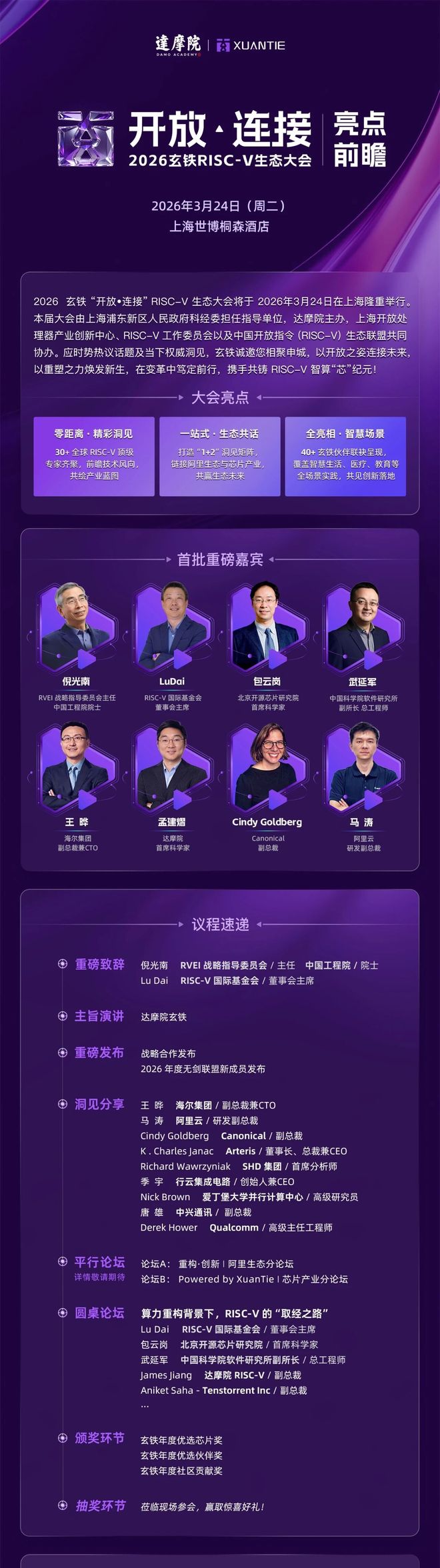 2026年3月24日,由浦东新区人民政府科经委指导,达摩院主办,上海开放处理器产业创新中心、RISC-V工作委员会、中国开放指令(RISC-V)生态联盟联合协办的本届玄铁RISC-V生态大会,将在上海世博桐森酒店盛大启幕。