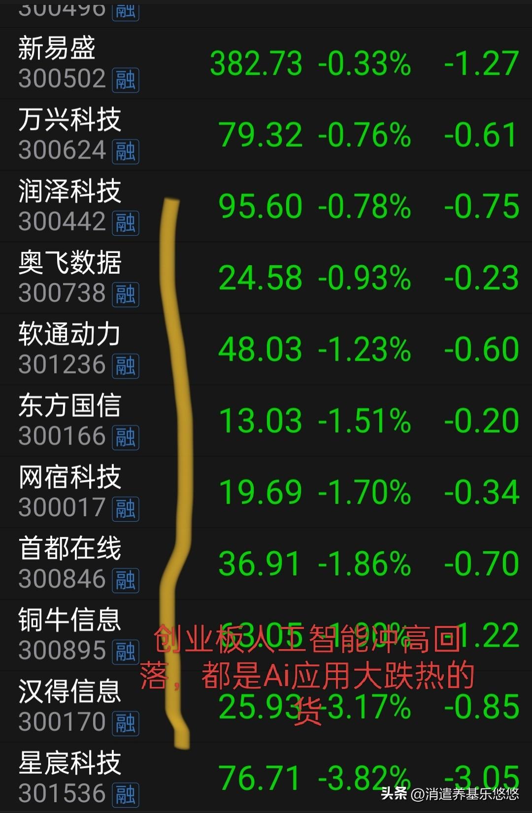 盘中创业板人工智能指数一度大涨近4%,而后快速下跌,大幅回落。看了一下,主要原因是里面的成份股…Ai应用板块股票冲高回落大跌。A应用周一涨幅居前,今天就补跌。所以A应用板块不能长期持有,波动太大,持续性上涨太差。