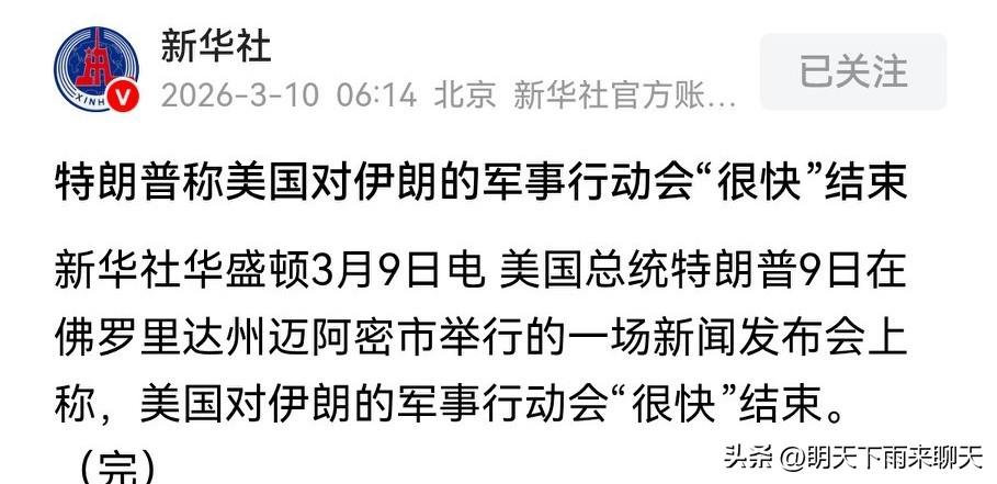 特朗普确实不想打了吗? 应该确实不想打了吧,几十个基地被炸烂了,雷达预警系统也损失惨重,航母面临威胁躲得远远的,进攻及防守端的导弹库存即将见底,这仗还真的打得吃力,国内反战情绪高涨,如果因为这场仗而输掉中期选举,那就真的得不偿失了。 但是,他可以命令美军立即撤出战斗,结束对伊朗的战斗,但是,以色列同意吗?伊朗同意吗? 恐怕要结束军事行动,并不会像他说的那样轻松?