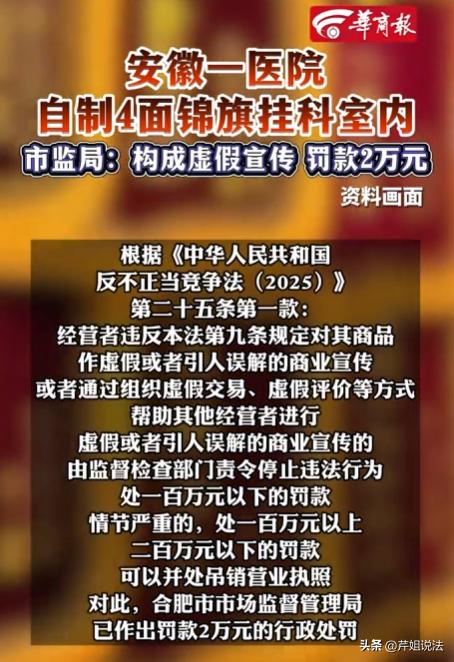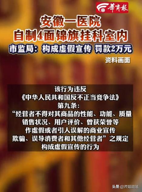 安徽合肥,某医院科室主任李某,为提升科室人气、增加患者量,竟想出歪招。他带着同事自掏腰包定做4面锦旗挂在科室,营造医术高超假象。市监局日常检查时,发现锦旗是假的,李某的计划泡汤。原来,科室竞争激烈,患者量上不去影响收入,李某羡慕隔壁科室真锦旗多,便想出这低成本见效快的办法,结果被执法人员当场戳穿。最终,医院及科室因虚假宣传被罚款2万元。 谁也没想到,一个科室主任能想出这么离谱的招,太急功近利了。 李某那点心思,说白了就是急眼了。 周边医院、各个科室卷得厉害,他所在的科室门可罗雀,患者少得可怜,连带着医生们的工资绩效都跟着往下掉。 他每天看着隔壁科室,人家墙上挂满了患者送的真锦旗,来来往往全是看病的人,生意好得不行,再看看自己这边,冷冷清清,心里能不慌吗? 急归急,也不能走歪路! 他居然拉着科室同事一起,自掏腰包,找地方定做了4面锦旗,清一色的夸赞医术高明、医德高尚,往科室最显眼的地方一挂,装模作样营造那种口碑爆棚、医术高超的假象。 他打得算盘倒挺精,觉得这办法成本低,见效又快,不用花大价钱,挂几面锦旗就能骗来患者,简直是一本万利。 可他忘了,纸终究包不住火,市监局的人也不是傻子,日常检查的时候,一眼就看出不对劲了。 哪有那么巧的,锦旗都是崭新的,没有一点磨损,而且上面的措辞都大同小异,连落款都含糊不清,稍微一查,就戳穿了李某的小把戏。 当时李某脸都白了,忙活了一场,不仅没骗来患者,反而把自己给坑了,真是偷鸡不成蚀把米,太丢人了。 有人说,不就是几面锦旗吗,至于罚款吗? 还真至于,这可不是小事,已经触犯法律了。 自做锦旗挂科室,真的算违法吗? 当然算,而且是明确的虚假宣传。 依据《反不正当竞争法》第九条规定,经营者不得对其商品的性能、功能、质量、销售状况、用户评价、曾获荣誉等作虚假或者引人误解的商业宣传,欺骗、误导消费者和其他经营者。 李某作为科室主任,科室属于医疗机构的经营主体,他定做假锦旗悬挂,本质就是伪造“用户评价”和“曾获荣誉”,故意误导患者,让患者以为科室医术高超,进而选择就诊,这完全符合虚假宣传的构成要件。 罚款2万元,是多是少? 很多人觉得罚得轻,其实这是结合情节裁量的。 根据《反不正当竞争法》第二十五条,虚假宣传可处100万元以下罚款,情节严重的处100万至200万元罚款。 本案中,李某只是定做4面锦旗,尚未造成严重后果,也没有骗取大量患者钱财,所以市监局裁量罚款2万元,既合法又合理,是对违法行为的惩戒,也是对行业的警示。 很多人觉得锦旗是“小事”,不算广告,这是大错特错。 锦旗在医疗领域,就是一种隐性的口碑宣传,其误导性比直白广告更强,因为患者会默认锦旗是真实患者赠送,信任度更高。 本案处罚的是医院及科室,而非李某个人,很多人疑惑为什么不罚个人? 因为李某的行为是职务行为,其目的是为了提升科室业绩,受益方是科室和医院,所以法律责任由单位承担,但医院可内部追责李某。 说句实在的,医疗行业的核心是医术和医德,靠造假博眼球、骗患者,终究是搬起石头砸自己的脚。 患者看病是为了治病,不是看锦旗多少,就算一时被虚假宣传欺骗,一旦发现真相,不仅会投诉举报,还会彻底失去信任,到时候科室的名声就彻底臭了,再想挽回都难。 更重要的是,这起案件给所有医疗机构提了个醒,监管越来越严,任何投机取巧、虚假宣传的行为,都逃不过执法部门的眼睛,别抱着侥幸心理,脚踏实地做好诊疗服务,才是长久之计。 很多医疗机构都有挂锦旗的习惯,但一定要记住,锦旗必须是真实患者自愿赠送的,一旦造假,哪怕只是几面,也属于违法行为,轻则罚款,重则吊销营业执照,得不偿失。 最终,医院及涉事科室因构成虚假宣传,被市场监督管理部门依法罚款2万元,责令立即拆除虚假锦旗,停止虚假宣传行为。 医德立身,医术致远,虚假锦旗撑不起医疗公信力,投机取巧换不来长久发展。 大家觉得这2万元罚款合理吗?面对医疗行业的虚假宣传,我们该如何更好地维护自身权益,一起来讨论讨论吧!
