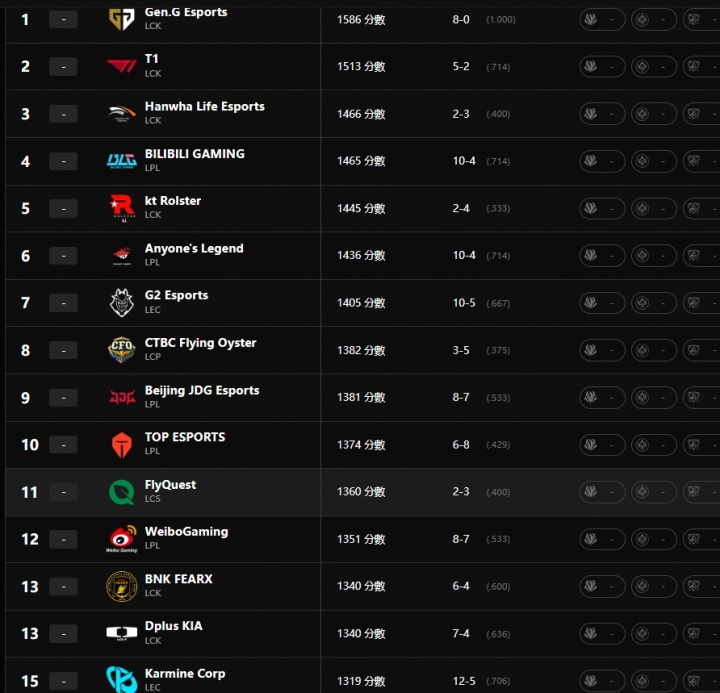 LPL的BLG第四高于KT,AL仍位居第六高于第九的JDG,而BFX在第十三还低于TES!