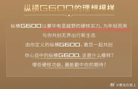 纵横G600 纵横G600概念车已经亮相车整体呈现出方盒子造型,配备有隐藏式车门把手车顶行李架和全地形轮胎等配置近日纵横G600发布招募产品共创官信息结合“纵横G600以豪华电混越野的硬核实力为年轻而来”的官方描述猜测该车很可能定位于新能源硬派越野车型或主要面向年轻用户群体 中国车的开发速度实在太快了