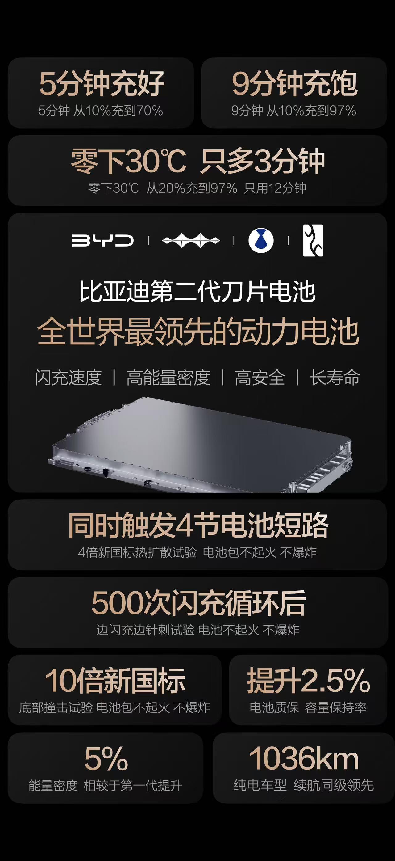 比亚迪第二代刀片电池一发布,直接让快充界集体沉默,闪充快就算了,安全和寿命还双拉满,这实力真的太炸裂了! 常温5分钟充好、零下30度低温闪充也就多3分钟,充电慢、冬天充不上电的老痛点,直接被比亚迪一脚踹飞! 肯定有人会问,闪充这么快,电池寿命不就废了?格局打开!比亚迪的锂离子高速通道+全温域智能热管理系统,让闪充少产热、快散热,寿命几乎没影响,闪充和长寿命直接兼得! 安全这块更是狠到离谱!500次闪充循环后边充边针刺,没热失控没起火。4节电芯短路不扩散,10倍新国标底部撞击也稳如泰山,全生命周期安全直接拉满! 质保还疯狂加码,容量低于77.5%免费换,电芯终身保修,腾势、比亚迪王朝网、海洋网多款车型都能搭载,这波福利直接给到用户! 比亚迪不愧是电池起家的大佬,从第一代刀片电池定义安全,到第二代打破闪充和寿命的矛盾,硬核闪充技术树立行业新标杆,新能源电池的天花板,又被比亚迪拉高了!
