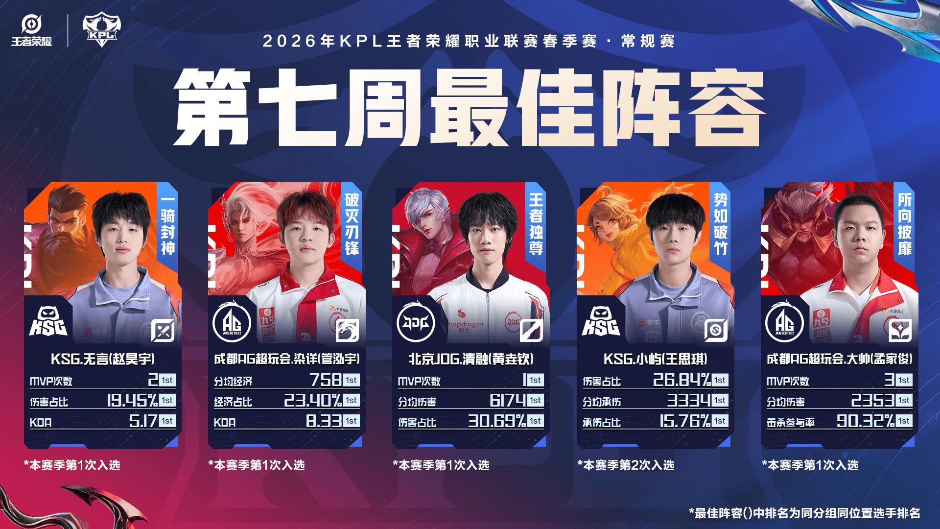 虎扑03月10日讯2026KPL春季赛第七周最佳阵容:无言/染详/清融/小屿/大帅