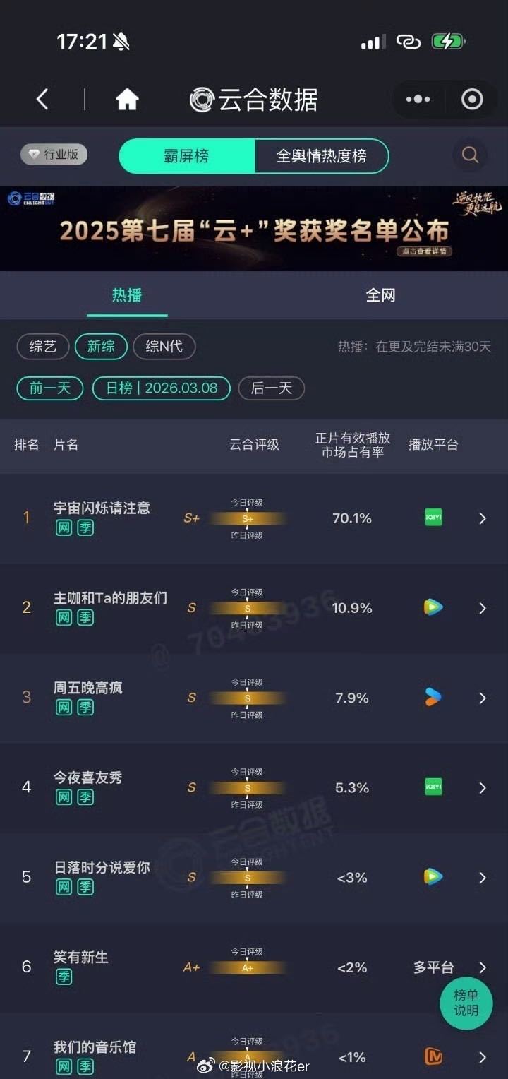 宇宙闪烁请注意喝汤宇宙闪烁请注意70.1% 恭喜《宇宙闪烁请注意》!作为新综成功喝上汤,云合数据高达70.1%,吸干大盘,实力碾压同期。高能量熟人局的解压设定,加上嘉宾们的精彩表现,收获这份成绩当之无愧。