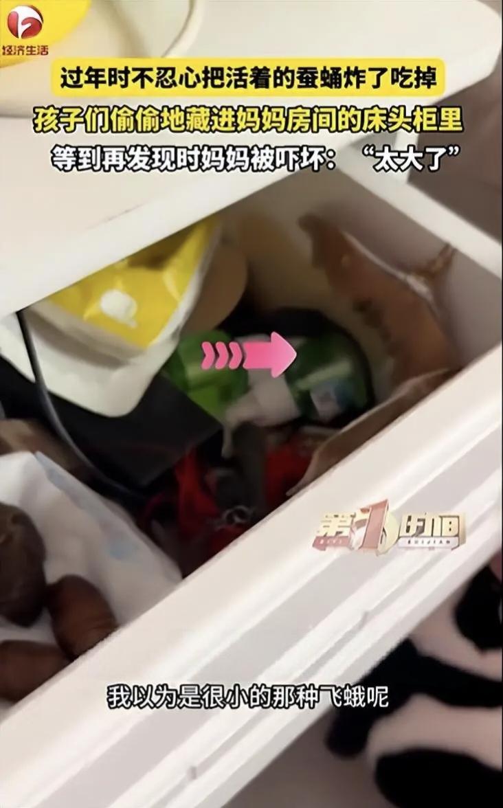 黑龙江俩孩子大年三十那天把蚕蛹藏进妈妈床头柜,再发现时已化成大飞蛾!妈妈打开吓出尖叫:我天天在旁边睡觉啊! 大年三十那天要炸着吃的蚕蛹,被俩孩子偷偷藏进了妈妈的床头柜。 前两天孩子去抽屉找东西,刚打开就喊妈过来看。 肖女士凑过去半天没看明白咋回事,孩子急得在旁边一直说“旁边有两个大的”! 她定睛一看,两个大飞蛾趴在抽屉内壁上,母子三人当场吓出尖叫。 肖女士说当时真以为自己眼花了。 那几个蚕蛹本来是除夕的食材,活的孩子不忍心吃,就想藏起来“救它们一命”。藏完转头就忘了这茬。 她越想越后怕,天天睡觉的床头柜里,就那么悄没声地完成了羽化。 那俩扑棱蛾子啥时候破的茧、在里头趴了多少天,她根本不知道。 要不是孩子突然找东西,这“舍友”还不知道要处到啥时候。 但是这事也不能全怪孩子。 在他们眼里那哪是啥高蛋白,那是活生生的小生命。 孩子哪懂啥是变态发育,就是想偷偷养起来,过几天给妈个惊喜。 结果惊喜变成惊吓,还附赠一节生物课。 你们家孩子小时候有没有往家里藏过啥让你头皮发麻的东西?