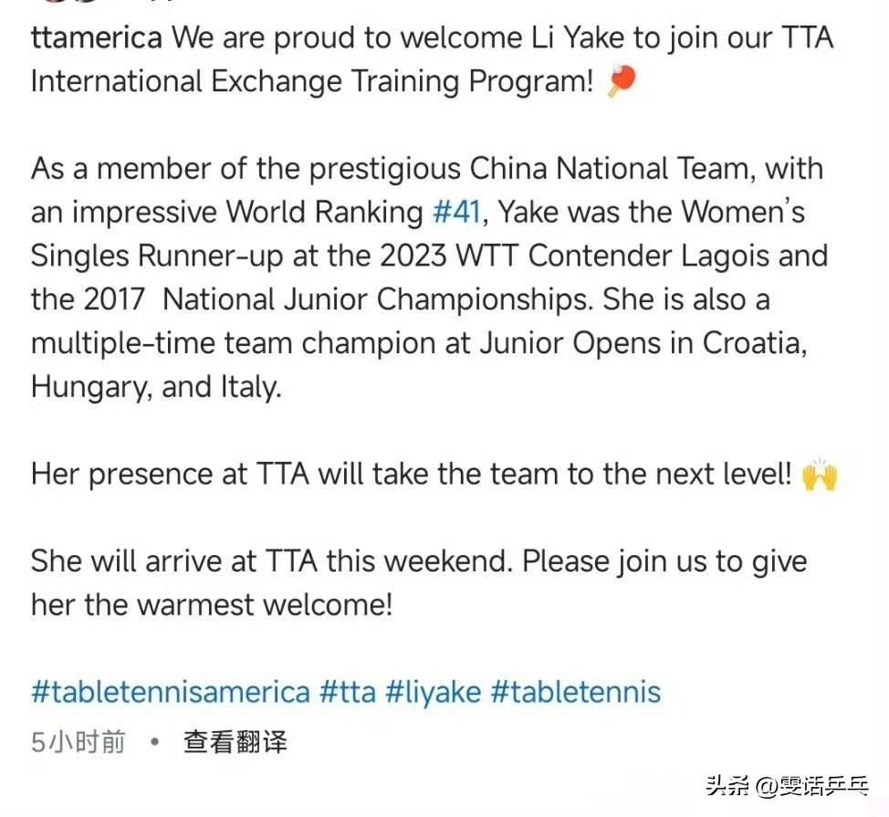 美国乒乓球俱乐部(TTA):我们荣幸地欢迎李雅可加入TTA国际交流训练计划!🏓 作为中国国家乒乓球队队员,李雅可世界排名第41位,成绩斐然: - 2023年WTT拉各斯挑战赛女单亚军 - 2017年全国青年锦标赛女单亚军 - 多次斩获克罗地亚、匈牙利、意大利青少年公开赛团体冠军 她的加入将助力TTA团队更上一层楼!🙌 李亚可将于本周末抵达TTA,让我们共同为她送上最热烈的欢迎! 2026.3.10