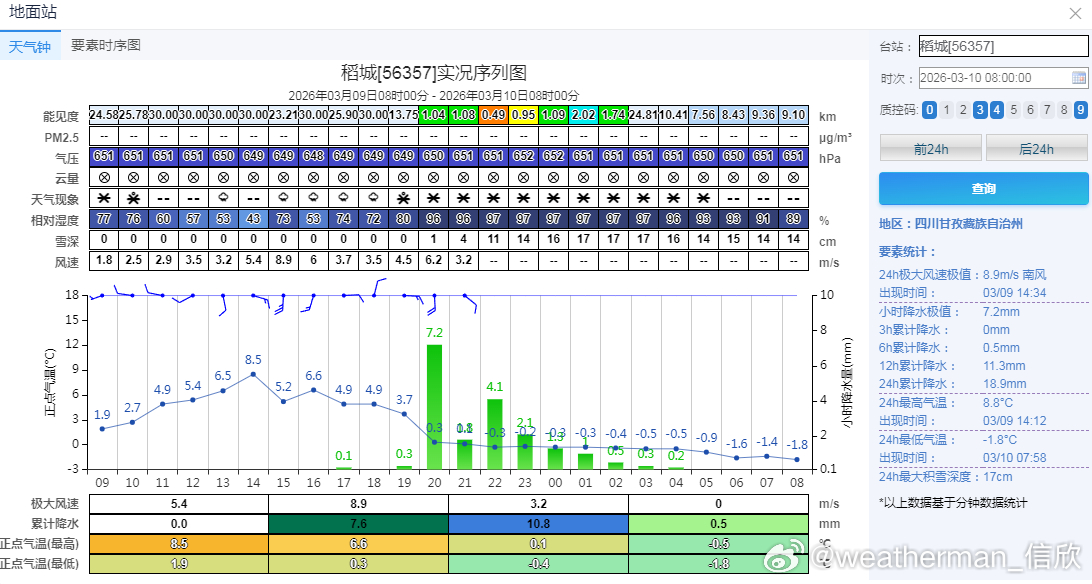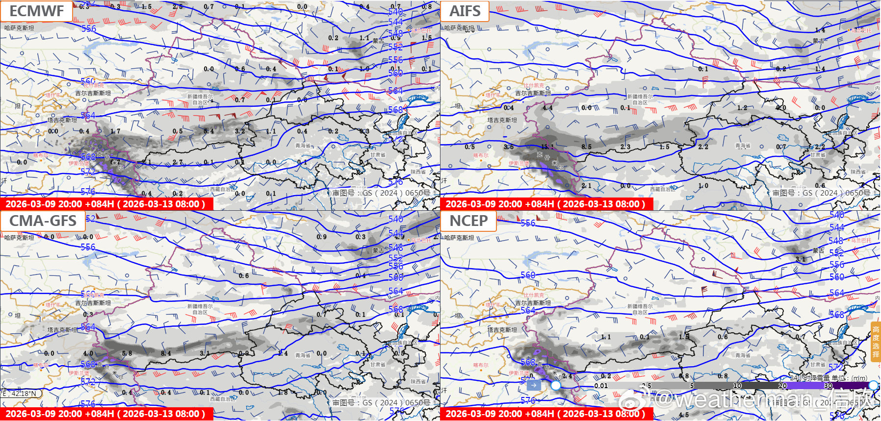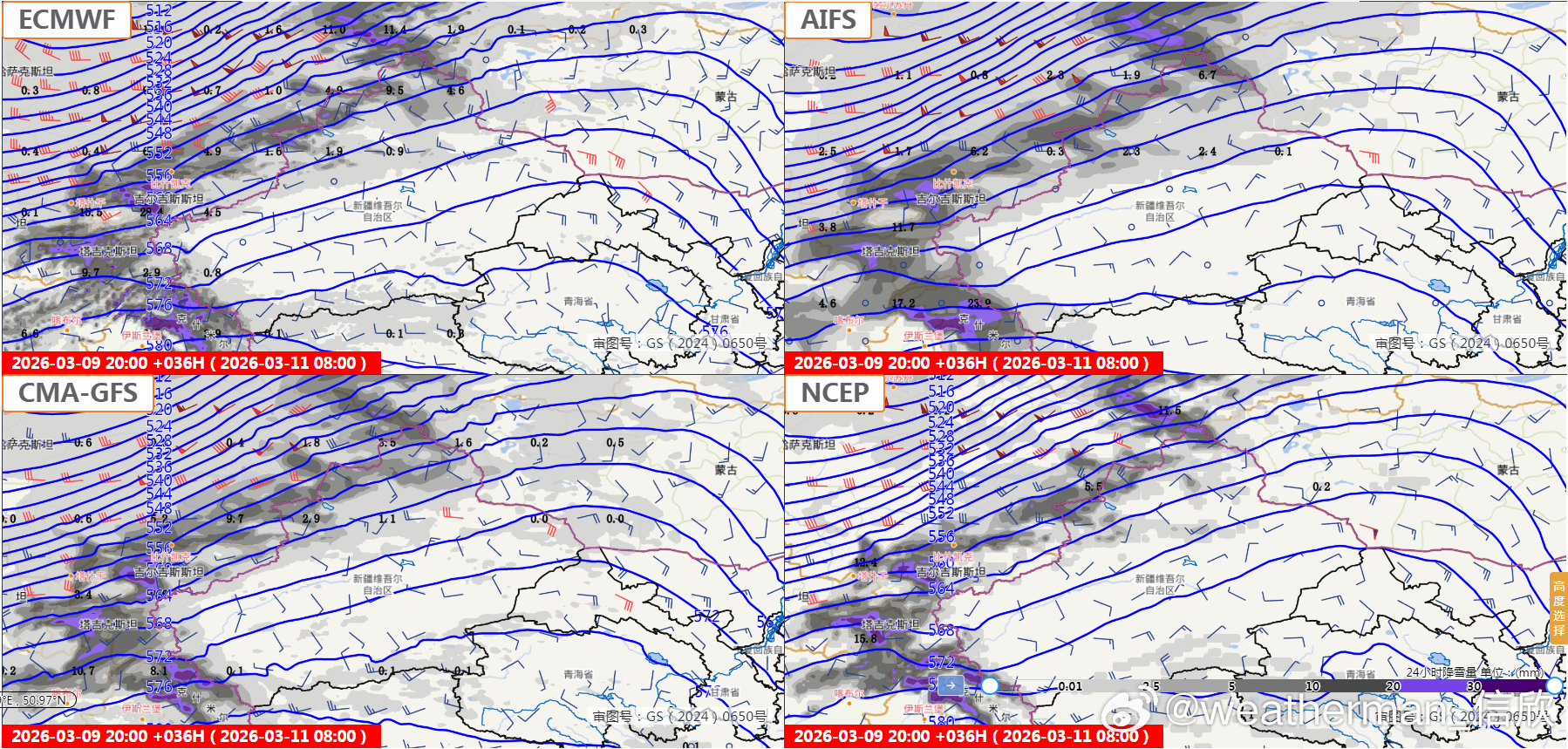 【雨雪——重点转到新疆】昨天到今晨,南方降水范围依然不小,其中四川西部的稻城出现暴雪,今晨积雪14厘米。今明南方的降水明显缩减,多地放晴,今后3天雨雪重点转到新疆。而且风也不小(图3),新疆可能出现风雪交加,甚至混合沙尘的情况。图4-6为官方报,图7-9为数值预报的降雪对比。