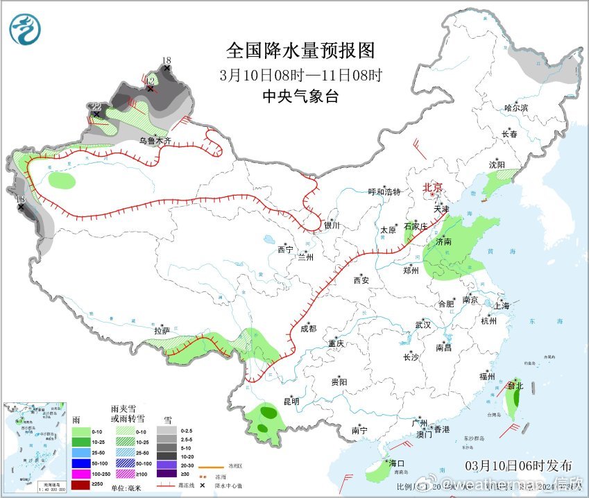 3月10日08时至11日08时,新疆西北部和南疆西部山区等地部分地区有大到暴雪,局地大暴雪(20~22毫米)。3月11日08时至12日08时,新疆沿天山地区和南疆西部山区等地部分地区有大到暴雪,局地大暴雪(20~24毫米)。3月12日08时至13日08时,新疆东部和南疆山区等地部分地区有大到暴雪(10~15毫米)。
