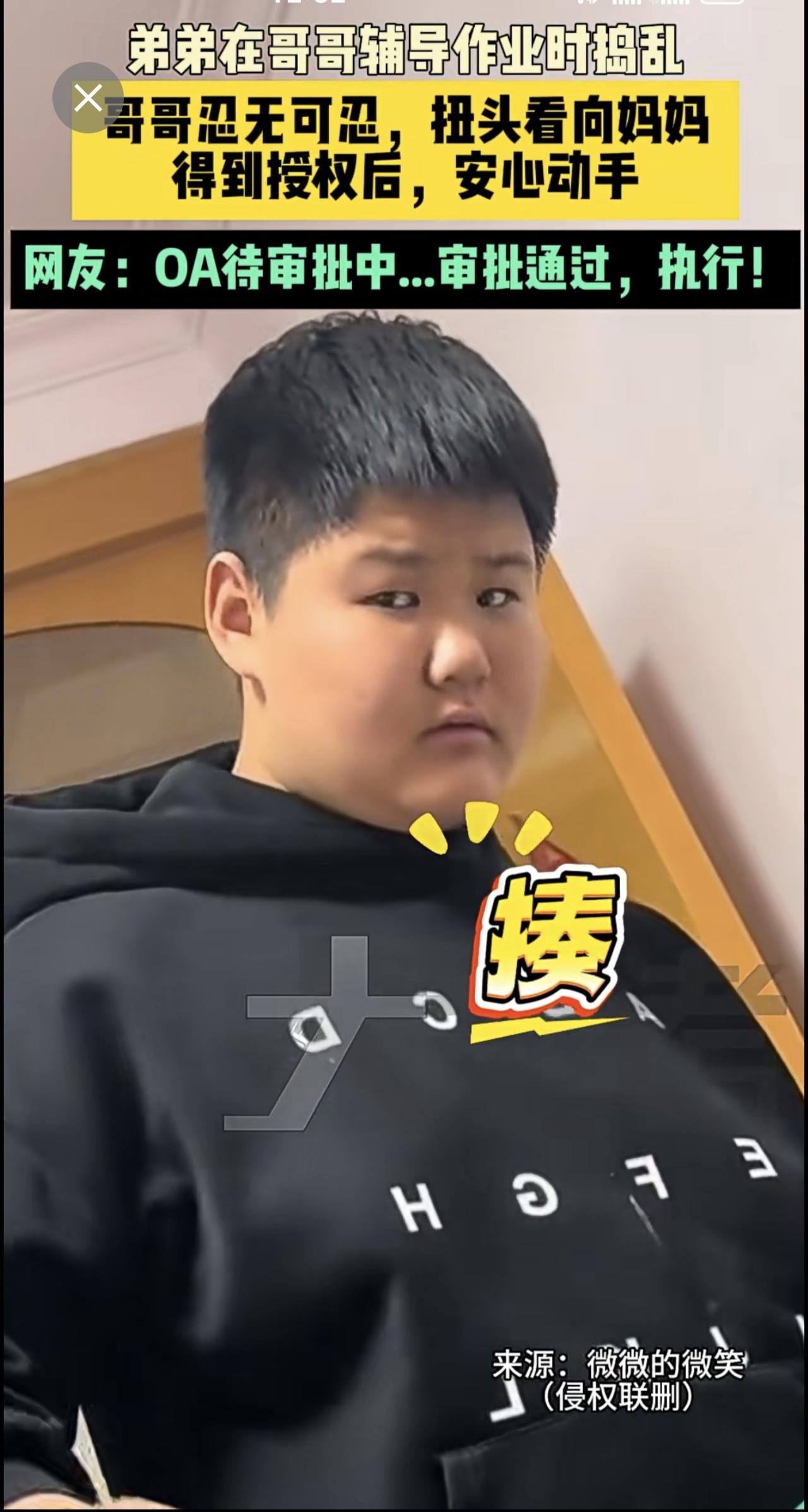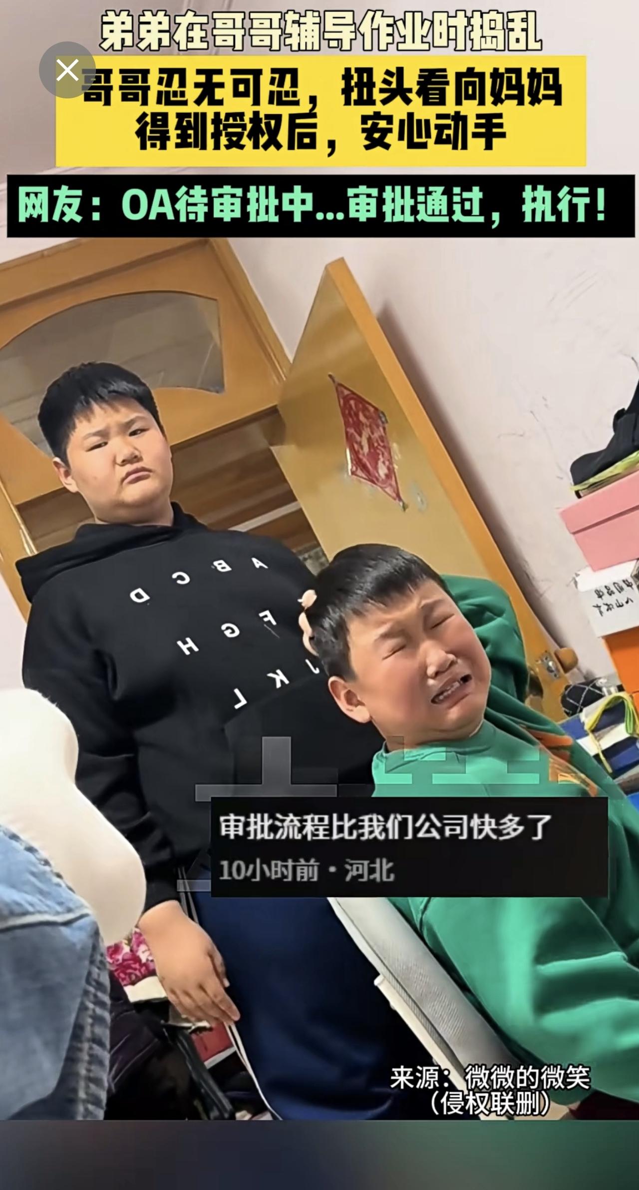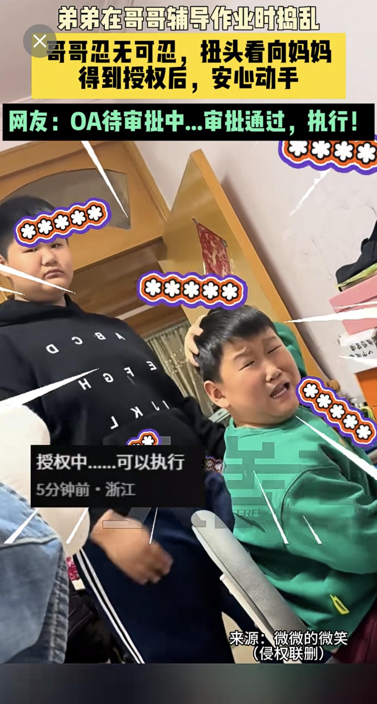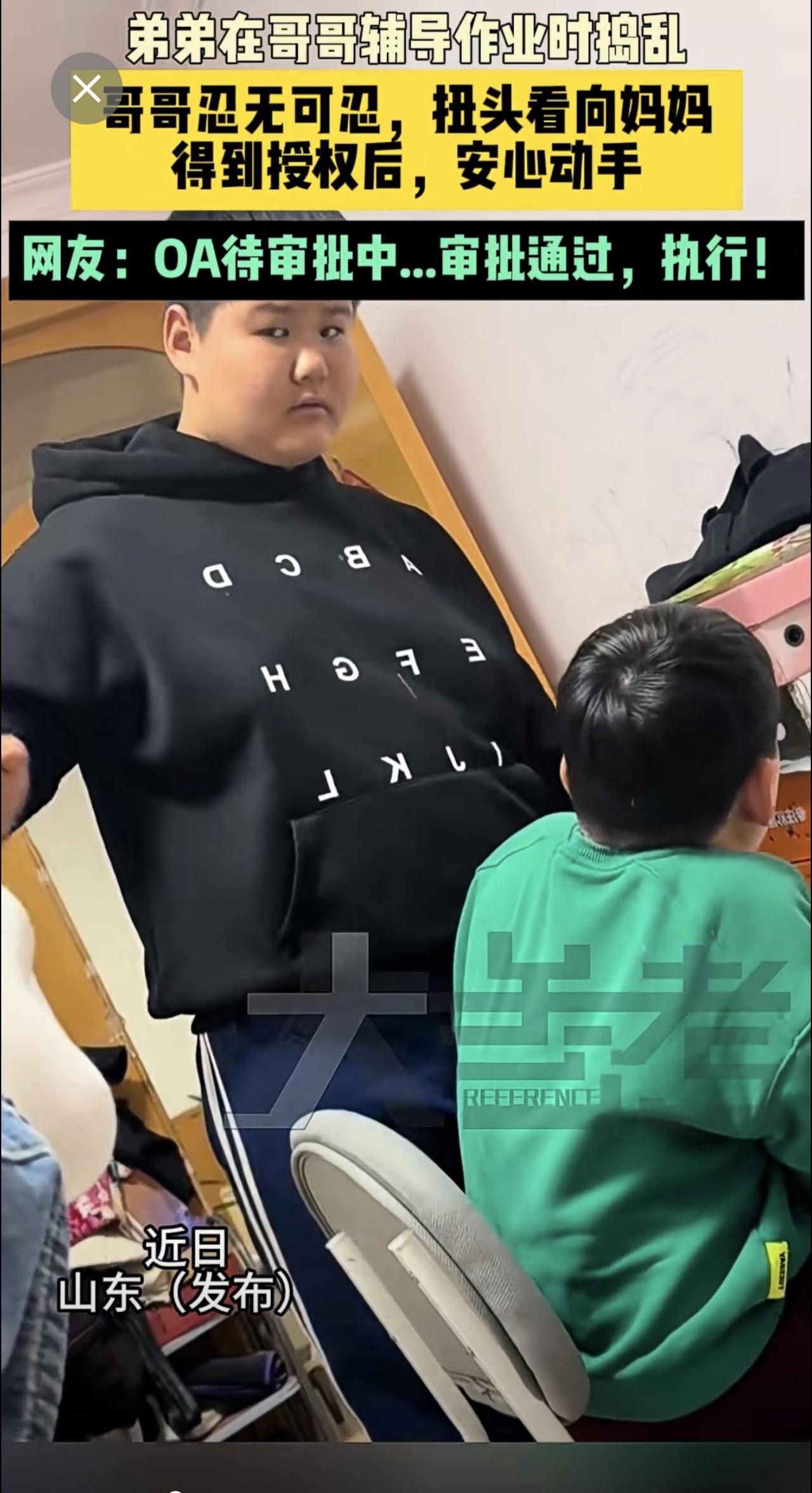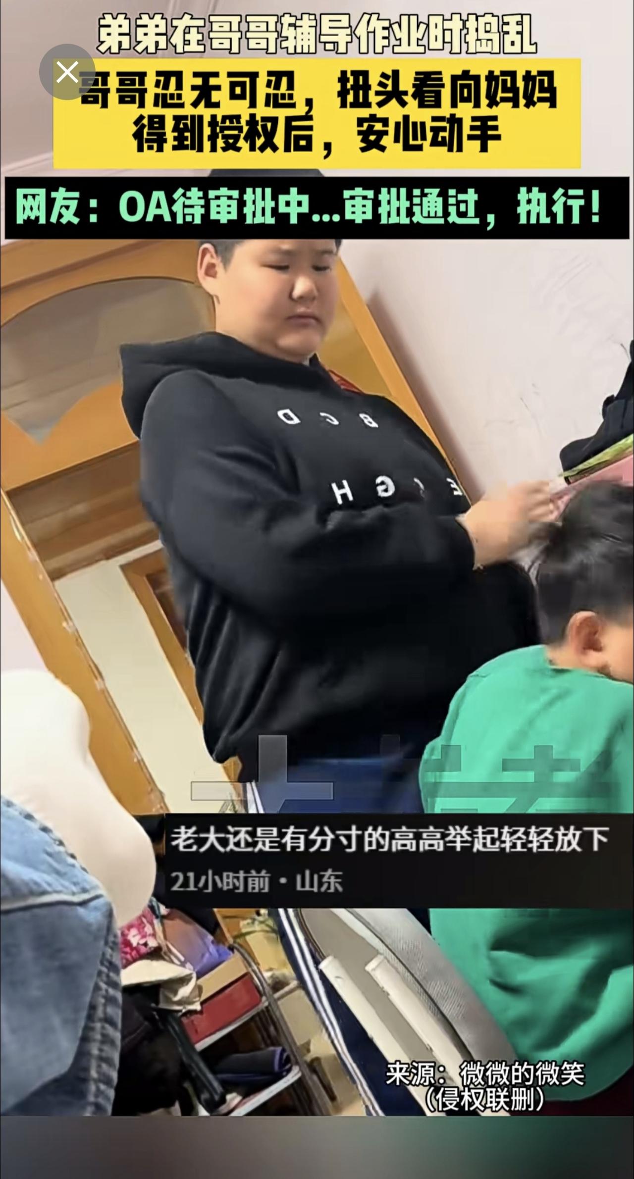 近日山东 (发布)弟弟在哥哥辅导作业时捣乱,哥哥忍无可忍,扭头看向妈妈,得到授权后,安心动手。网友:OA待审批中...审批通过,执行!