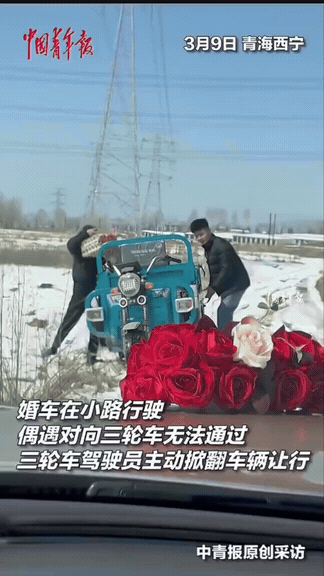 直接掀了!青海西宁,姑娘出嫁,婚车在小路上行驶,迎面碰上了骑着三轮车的母子,母子俩使劲的靠边停车后发现还是不行,没想到下一秒小伙竟直接将三轮车掀翻! 小路太窄,母子俩使劲往边上靠,也错不开车。 当地规矩,婚车不能掉头、不能走回头路,不然不吉利。 谁也没想到,小伙当场就让妈妈把车上的鸡蛋、菜拿下来,自己一使劲,直接把三轮车掀进旁边地里了! 一句话没多说,一点没为难人,就为了让婚车顺利过去。 婚车上的人赶紧拿红包下来感谢,妈妈推了半天,最后才不好意思地收下,笑着挥手让婚车先走。 这一幕,看着简单,却特别戳心。 他不是不心疼车,也不是不怕麻烦,就是觉得:人家一辈子结一次婚,不能因为自己耽误喜事。 先拿鸡蛋、不慌不忙掀车、妈妈默默配合、推辞红包……每一个细节都特别实在,没有一点演戏的样子,就是普通人最本分的善良。 其实善良真的很简单,不刁难、不计较、愿意成全别人,就够了。