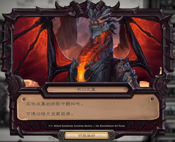 炉石传说 神话皮肤·死亡之翼暗月宝藏!上线时间:3月21日至4月11日,价格未知,此次头奖将提供极其震撼的双重奖励:死亡之翼神话英雄皮肤以及死亡之翼异画卡。神话皮肤和异画橙之间有联动,在神话皮肤的情况下使用异画橙,效果是头像变为“爆甲”状态独特的炽红色,且触发一场爆炸性的突袭,轰炸对手一侧的面板,使其面板边框化为闷烧的废墟。感觉瓦王瞬间变小丑了!