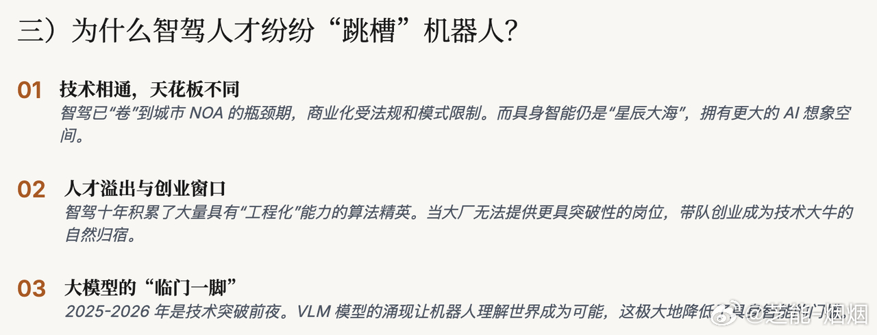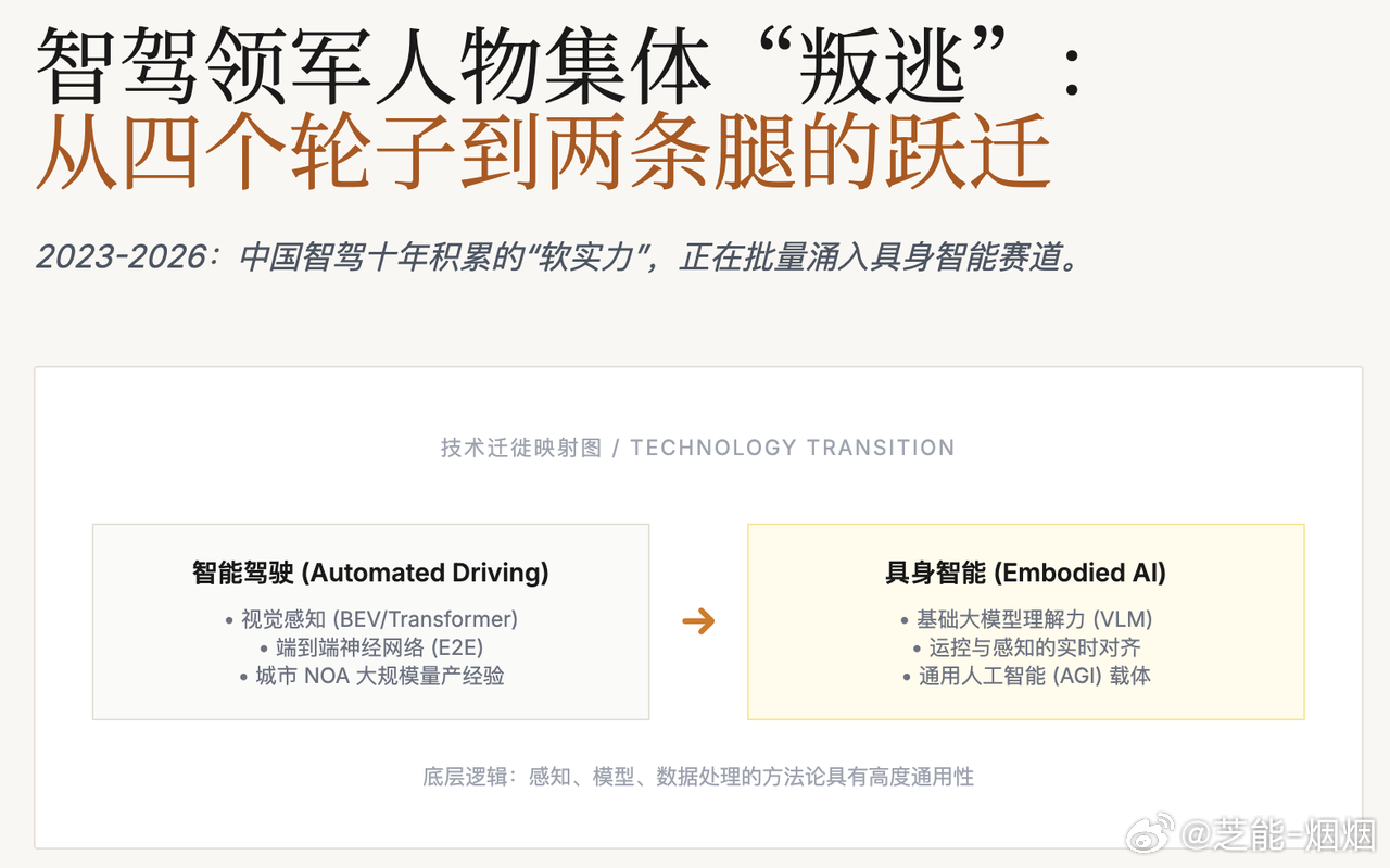 智驾与机器人底层技术高度相通,而智驾赛道逐渐进入存量竞争,具身智能则处在爆发前夜,空间更大、想象力更强。这场从车轮到双腿的技术迁移,正在重塑智能汽车与机器人两大行业的人才与格局。