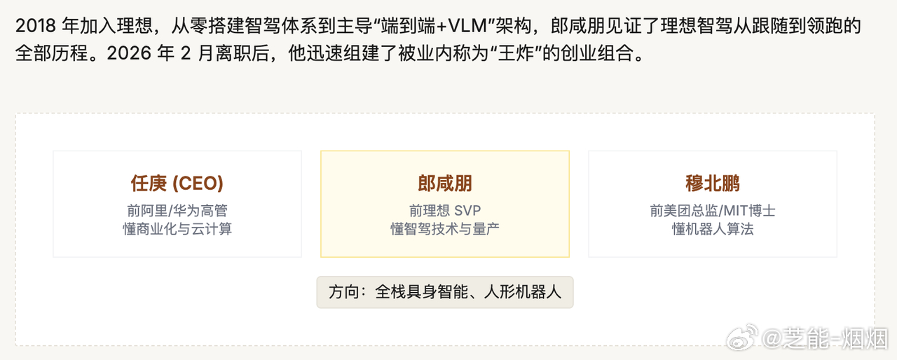 2026 年,智驾圈迎来一波明显的人才迁徙,理想汽车智驾核心负责人郎咸朋离职创业,投向具身智能赛道。不止他一人,近年已有大批车企与自动驾驶公司的技术大牛,纷纷转向机器人与具身智能领域创业。