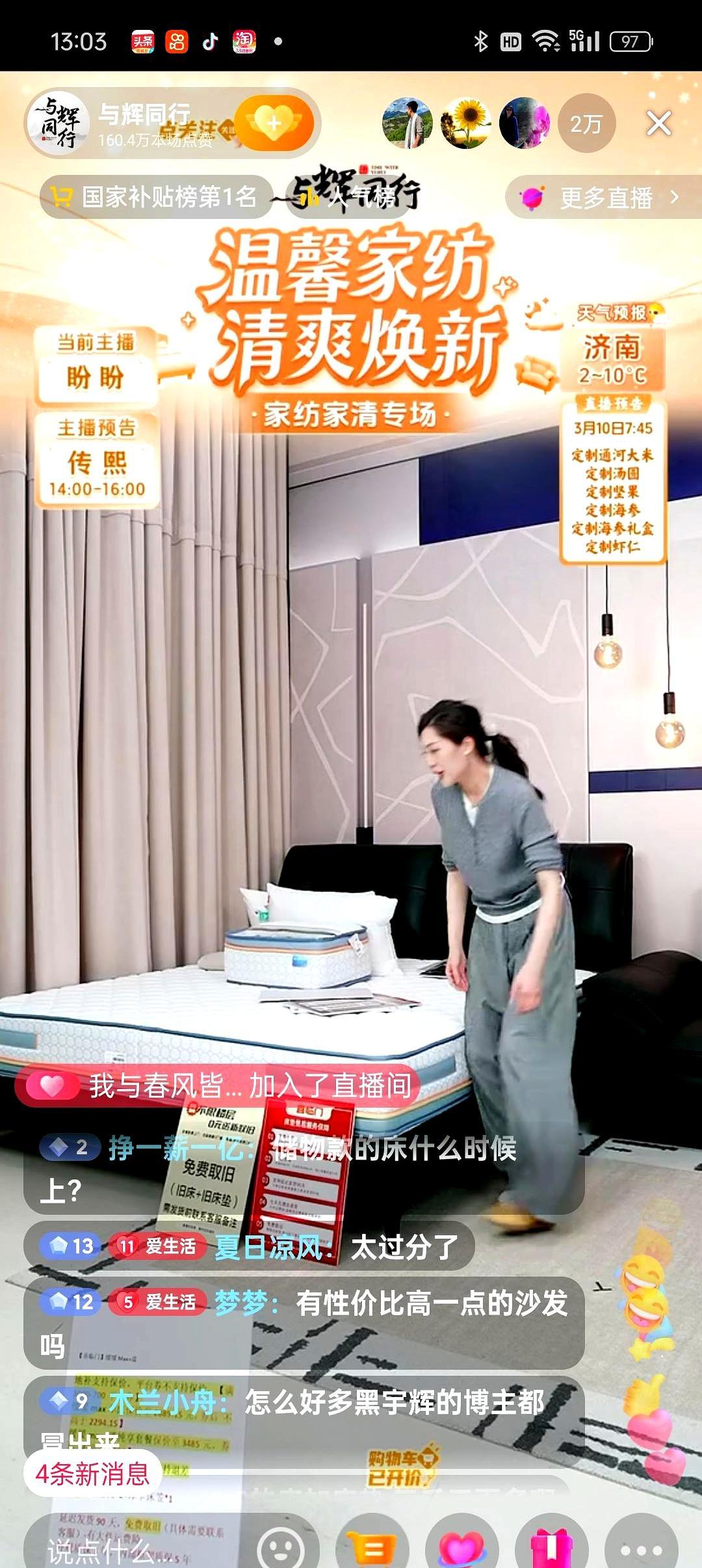 看个家居直播也能碰见恶意刷屏的黑子,真的太败好感了。 前几天盼盼在与辉同行讲床垫,刚把材质、尺寸讲了一半,就有几个号追着刷“别说了”“太过分了”,完全打乱正常互动节奏。 这类人早就不是第一次来蹲点搞事,不管是董宇辉还是其他主播开播,总能看见他们冒头刷莫名其妙的负面评论。 说实在的,不喜欢看直接划走就行,非要跳出来刷存在感,耽误主播讲干货,也耽误其他想买东西的人看参数。 现在直播间应对也很成熟,压根不搭理这类评论,该答疑答疑,该上链接上链接,家居专场单品照样卖破亿。 合得来就多待两分钟,合不来就划走,谁也别耽误谁。