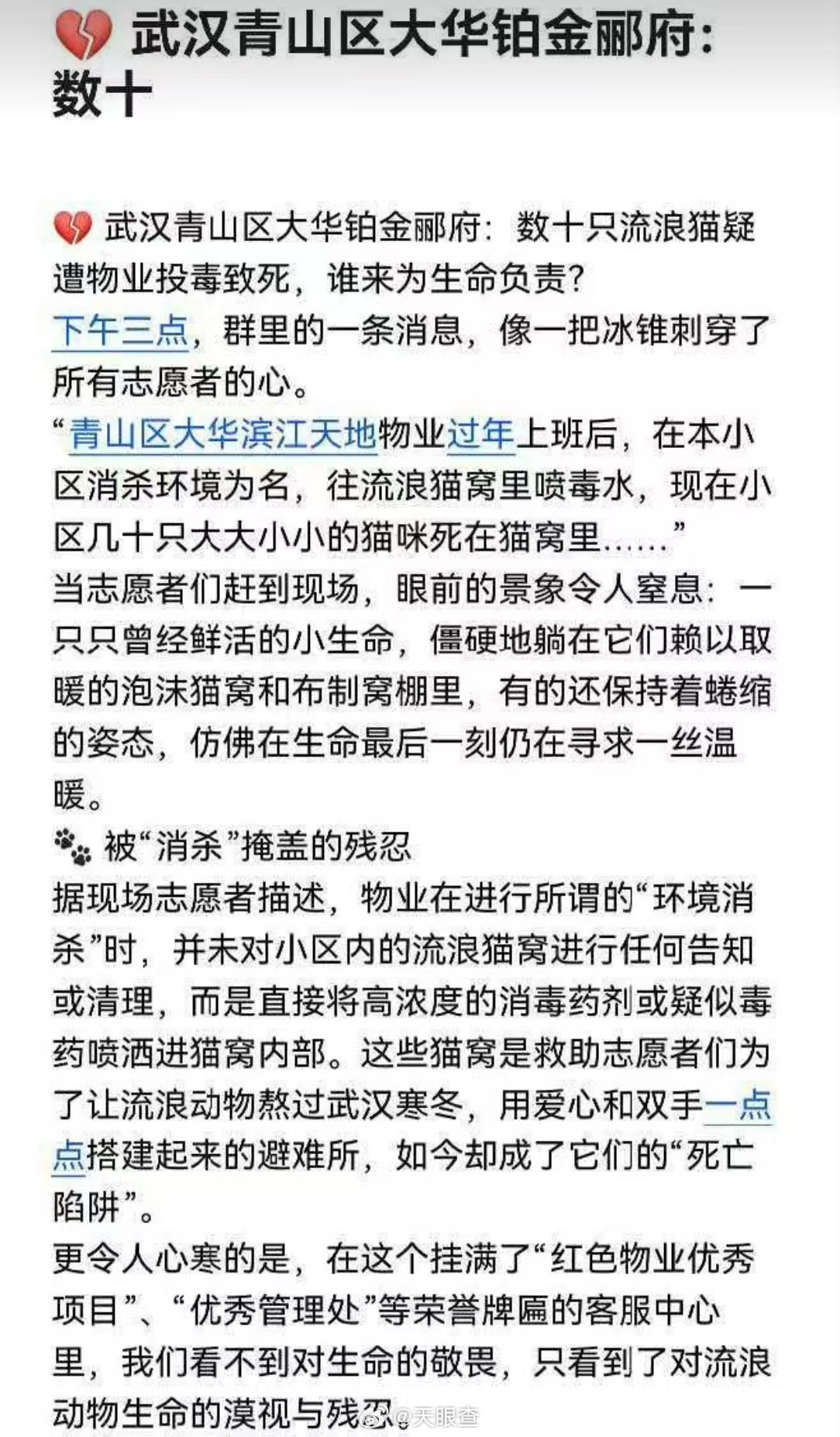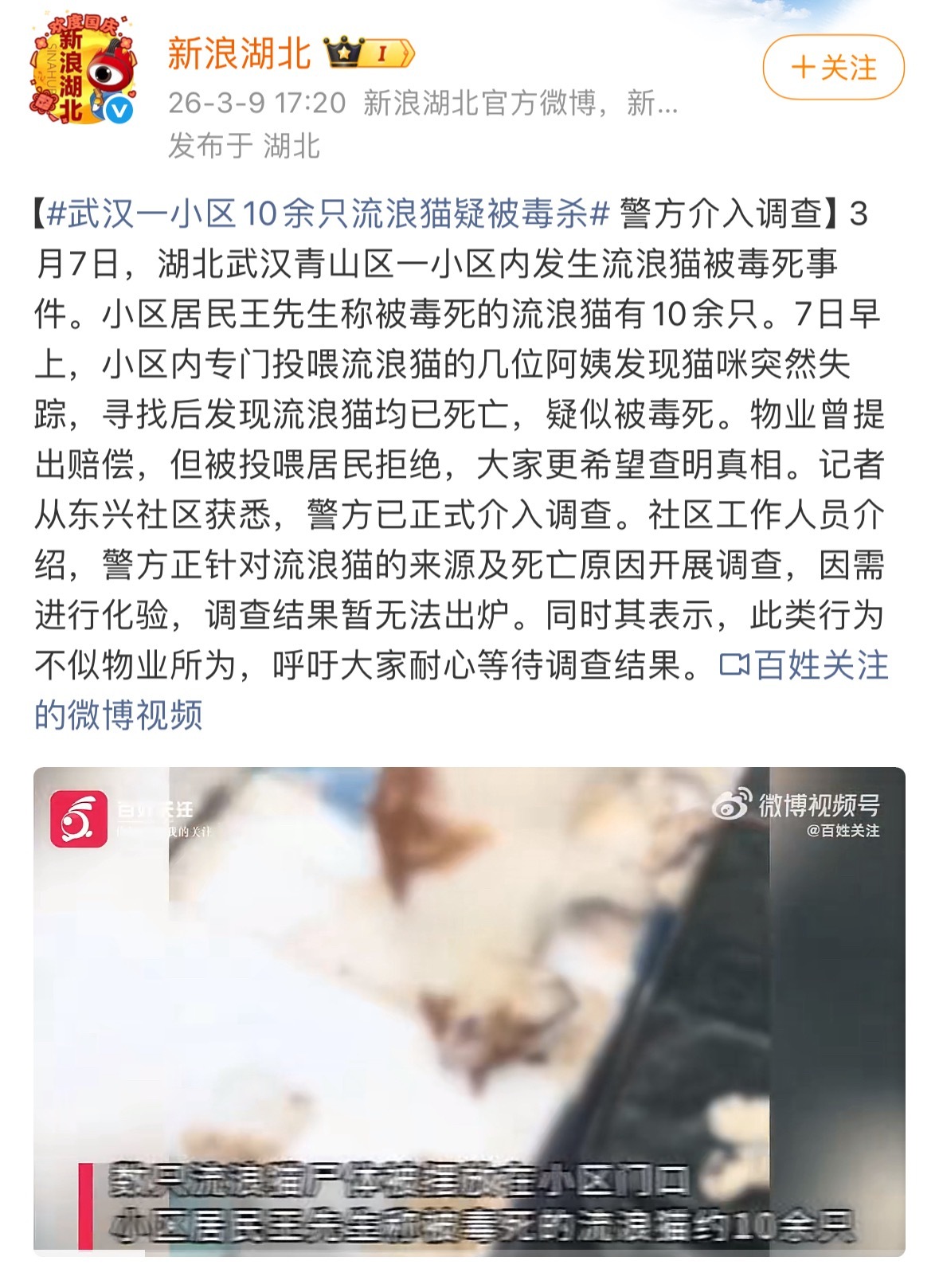 武汉一小区10余只流浪猫疑被毒杀一个小区里面居然有几十只流浪猫,这可太有爱心了。
