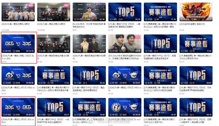 LPL第一赛段决赛BLG击败JDG夺得第一赛段优胜者,截止目前,只有BLG的比赛在B站录像里,播放次数超过80万。