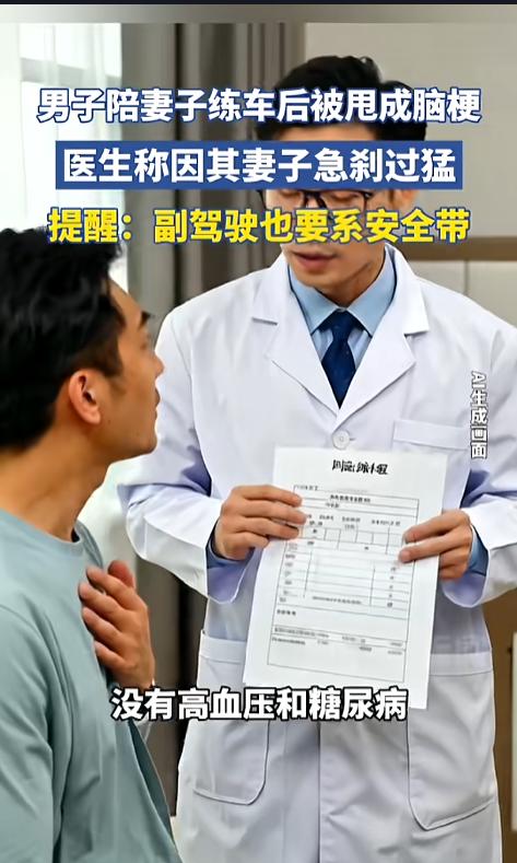 “这车不开也罢!”近日,河南郑州,一男子开会时突然发现自己说不出话来,大惊之下,赶紧去了医院。医生检查过后,竟然是脑梗塞。可男子此前并没有高血压糖尿病等基础病。细问之下,原因让人哭笑不得,竟然是陪妻子练车时甩出来的! 开车系安全带大家已经养成习惯了,随着交通法的严格,坐车系安全带也逐渐被大家接受。不过,系安全带并不只是保证撞击时乘客不飞出去,还会有些意想不到的作用呢。 据媒体3月9号报道,该男子平时身体很好,没有什么基础病。可没想到陪妻子练了几回车,自己竟然得脑梗了。 事发当日,该男子开会时突然说不出话来,他赶紧去了医院。医生一检查,发现他血管内膜损坏,出现了夹层,最终造成了脑梗。仔细询问之后,病因却出乎所有人意料。 原来,男子的妻子刚拿驾照,开车很不熟练,男子就坐在副驾驶陪她练车。可是练车的时候,男子从不系安全带,妻子每次刹车都很急,男子的脖子就这么一甩一甩的,次数多了,就导致了现在的样子。 网友看后表示,没想到安全带还有防脑梗的作用呢!人家安全带发明出来就是为了保障司乘安全的,你既然坐车就乖乖系好,现在倒好,把自己整成了脑梗,实在是得不偿失! 大家在乘车时一定要系好安全带,不仅仅是为了应付交警检查,而是万一发生意外,安全带是真的可以救命的。不怕一万就怕万一,千万不要拿自己的性命去赌! 信息来源:《男子陪妻子练车后被甩成脑梗,医生称因其妻子急刹过猛,提醒:副驾驶也要系安全带》潮新闻