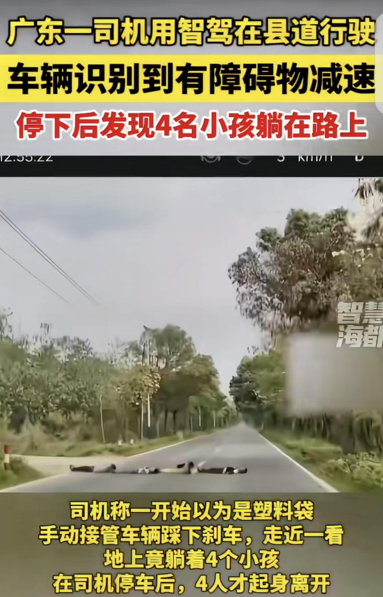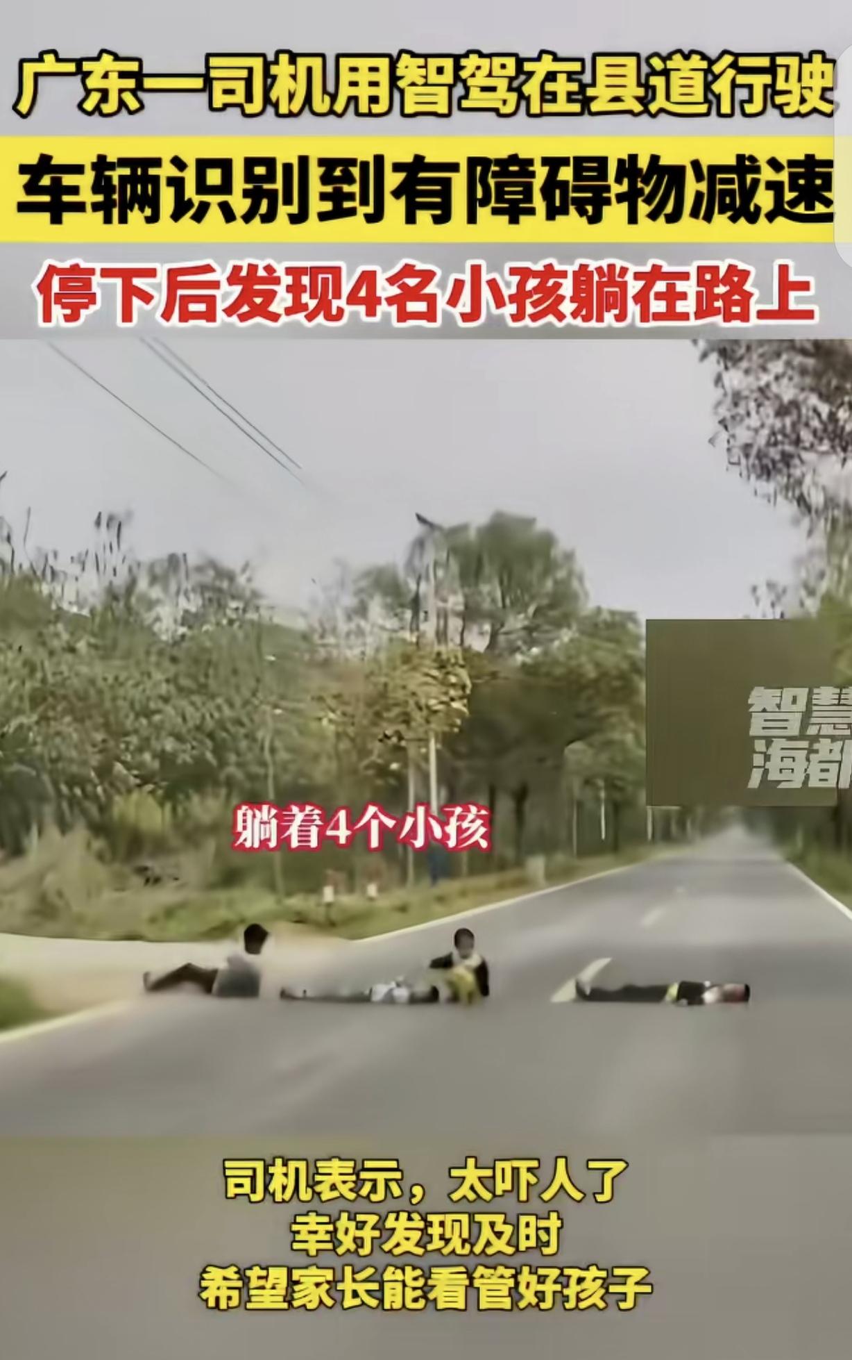 “真是后怕!”广东清远,一男子用智驾,在县城道路行驶,突然,车子识别有障碍物减速,男子以为是塑料袋,就手动接管车子,踩下刹车,靠近查看,路上竟然躺着4个小孩,他停车后,4个小孩才爬起来离开。把男子吓出一身冷汗,幸亏自己发现及时,否则后果不堪设想。网友:这4个孩子里面,有一个坏种,家长要长点心了。 一男子开着具备智能驾驶功能的车,在县城道路上行驶。 县城的道路不算宽敞,两旁都是绿化和树林,很少有机动车和行人经过。 男子开启了智驾模式,让车子按照设定自动行驶,自己则在一旁留意着路况。 开了一会后,突然,车子毫无预兆地识别到前方有障碍物,自动开始减速。 李先生一开始没太在意,心里琢磨着可能是路上有个塑料袋之类的杂物。 毕竟在县城道路上,这种情况并不少见,所以他打算手动接管车子,踩下刹车,靠近看看究竟是什么东西? 当车子缓缓靠近时,李先生瞪大了眼睛,简直不敢相信自己看到的,路上竟然横七竖八地躺着4个小孩,都快把路堵严实了。 这4个小孩看起来年龄都不大,正毫无顾忌地躺在路中间,把大路当成自家的床了。 他们无一例外,都是四仰八叉,完全没意识到自己正处于极度危险的境地。 男子的心跳陡然加快,冷汗瞬间湿透了后背。 他赶紧将车稳稳停住,紧张地盯着那4个小孩。直到这时,4个小孩才像是刚反应过来,慢悠悠地爬起来,拍拍身上的灰尘,若无其事地离开了。 男子坐在车里,好一会儿才缓过神来。他心想,幸亏自己发现及时,车子也提前减速了,要是直接开过去,后果简直不堪设想。 这几个小孩躺在路中间,万一哪个司机没注意到,或者车速太快来不及刹车,那将会是一场多么惨痛的悲剧啊! 后来,男子把自己的行车记录仪发到了网上,立刻引起了网友们的热议。 大家纷纷表示,这4个孩子里面肯定有个“带头捣乱”的,不然不会做出这么危险的行为。 也有网友提醒家长,一定要长点心,加强对孩子的安全教育,不能让孩子在马路上随意玩耍,要让孩子明白马路的危险性。 有人说,作为一个负责任的成年人。这个时候不光要停车,保证它的安全。还要大声的呵斥,让他们感到恐惧并认为这是做错了。如果有条件可以通知他们的学校家长。这是一辈子的善事。因为我也碰到过这种情况。 幸亏用了智驾,要是人开的话,可能来不及反应,不能及时刹车。 这事儿真的太惊险了!4个小孩躺在路中间,这哪是玩耍,简直就是在“玩命”。 家长可得长点记性,不能光顾着自己忙,把孩子安全抛脑后。 孩子小不懂事,家长得时刻盯着、好好教育,让他们知道马路不是游乐场。 这也多亏了智驾提前减速,不然真出事儿,几个家庭都得破碎。希望这事能给大家都提个醒,重视孩子安全,别让类似危险再发生。 对此,你怎么看?