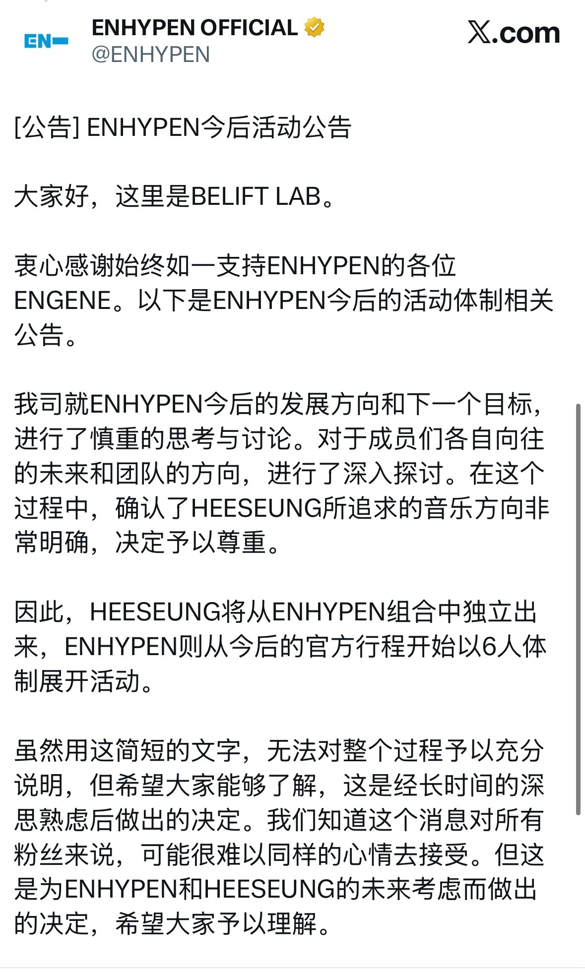 虽然用这简短的文字,无法对整个过程予以充分说明,但希望大家能够了解,这是经长时间的深思熟虑后做出的决定。我们知道这个消息对所有粉丝来说,可能很难以同样的心情去接受。但这是为ENHYPEN和HEESEUNG的未来考虑而做出的决定,希望大家予以理解。