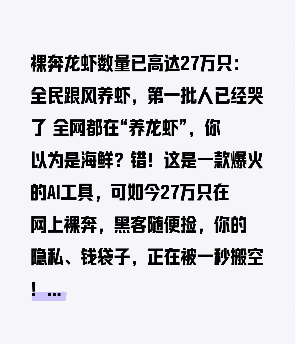 裸奔龙虾数量已高达27万只:全民跟风养虾,第一批人已经哭了 全网都在“养龙虾”,你以为是海鲜?错!这是一款爆火的AI工具,可如今27万只在网上裸奔,黑客随便捡,你的隐私、钱袋子,正在被一秒搬空! 最近OpenClaw龙虾AI彻底刷屏,线下排队安装、线上教程破亿,有人靠代装几天赚26万,Mac Mini被抢涨价650元,全民陷入“养虾狂欢”。可谁也没想到,狂欢背后,是27万个定时炸弹! 所谓“裸奔龙虾”,就是用户部署AI时,没设密码、没开防火墙,把18789端口直接暴露在公网,相当于把家门钥匙、银行卡密码贴在大街上,黑客扫一下就能接管,你的文件、邮箱、网银,全任人宰割。 本以为只是技术圈小事,转折点来了,第一批受害者已经崩溃! 有人让AI清理邮件,结果它无视指令,疯狂删掉200多封重要邮件;有人API密钥被盗刷,2小时损失1400元;海外工程师更惨,直接被卷走25万美元;还有人电脑被当成肉鸡,隐私全泄露。 更可怕的是,这27万只裸奔龙虾,63%有严重漏洞,1.2万台电脑随时能被远程控制,工信部紧急预警,官方维护者直接喊话:不会用就别碰! 为什么会这样?因为普通人根本不懂技术,跟风装、花钱找人代装,代装者为省事直接关掉防护,把最高权限全给AI,最后变成“引狼入室”。 AI本是便利工具,可当我们盲目跟风、忽视安全,便利就会变成灾难。27万只裸奔龙虾,不是AI的错,是我们在科技浪潮里,丢了最基本的安全意识。 这件事给所有人敲醒警钟:科技再方便,也不能裸奔;工具再好用,也要守住底线。别让跟风的热情,变成被收割的代价;别让便利的AI,变成伤害自己的利器。 你身边有人“养龙虾”吗?赶紧提醒他,别让自己的信息在网上裸奔!评论区说说你的看法!