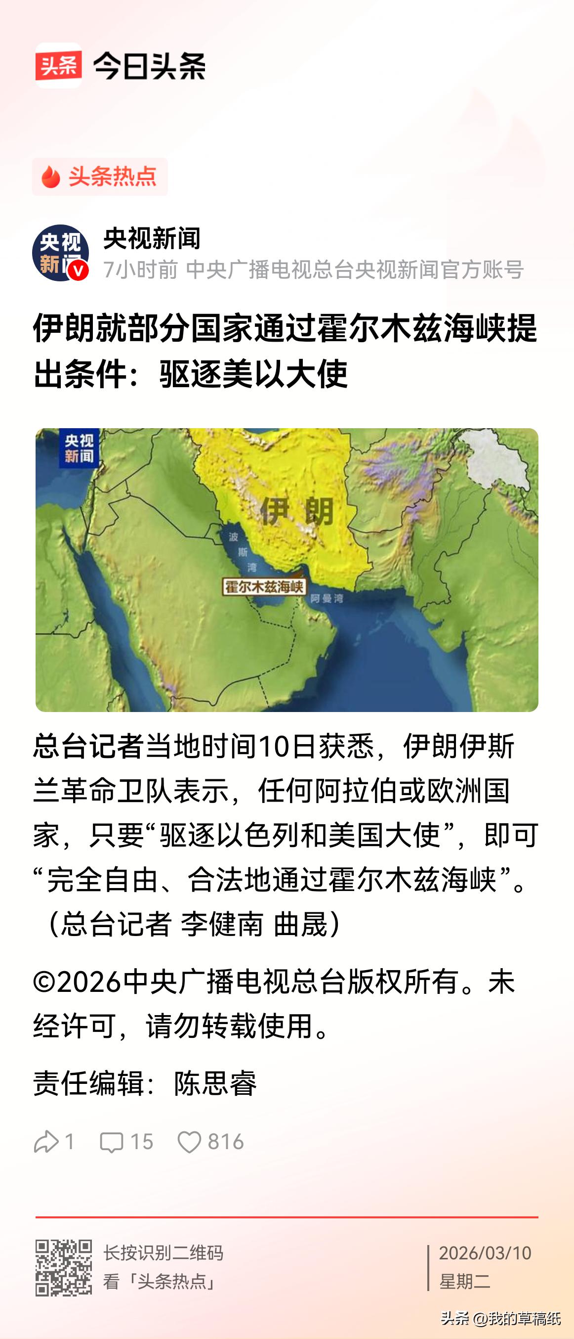 炸锅!霍尔木兹海峡新规:想过?先把美以大使赶出去! 谁能想到,全球能源咽喉,被一句话卡脖子了。 伊朗直接放话: 欧洲、阿拉伯国家, 驱逐美以大使,就能正常过海峡。 不赶人? 船别想走,油别想运。 最安心的是中国油轮。 咱们中立立场, 一路绿灯,安全通行不受影响。 这一招太狠,直接逼全世界站队。 油价要飞,航运要乱,好戏才刚开始。 你觉得会有国家真敢驱逐美以大使吗? 伊朗海峡危机 霍尔木兹危机 霍尔木兹争夺战