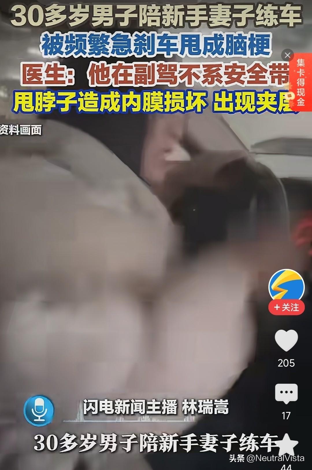 陪老婆练车男子得脑梗!医生提醒坐车要系安全带,新手女司机频繁大力刹车导致男子脑内膜受损。说归说、笑归笑、确实很多新手女司机驾驶方式超俗。方向半圈半圈的打、刹车一脚到底。遇到危险不知道要先刹车,只会大声哇哇叫!下车还埋怨什么破车这么难开。你们遇到同款新手女司机吗?