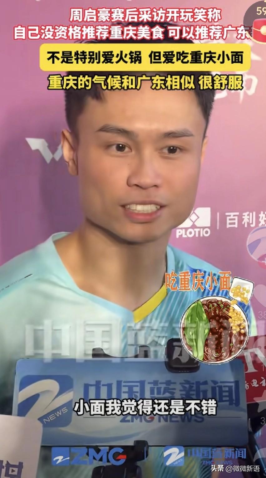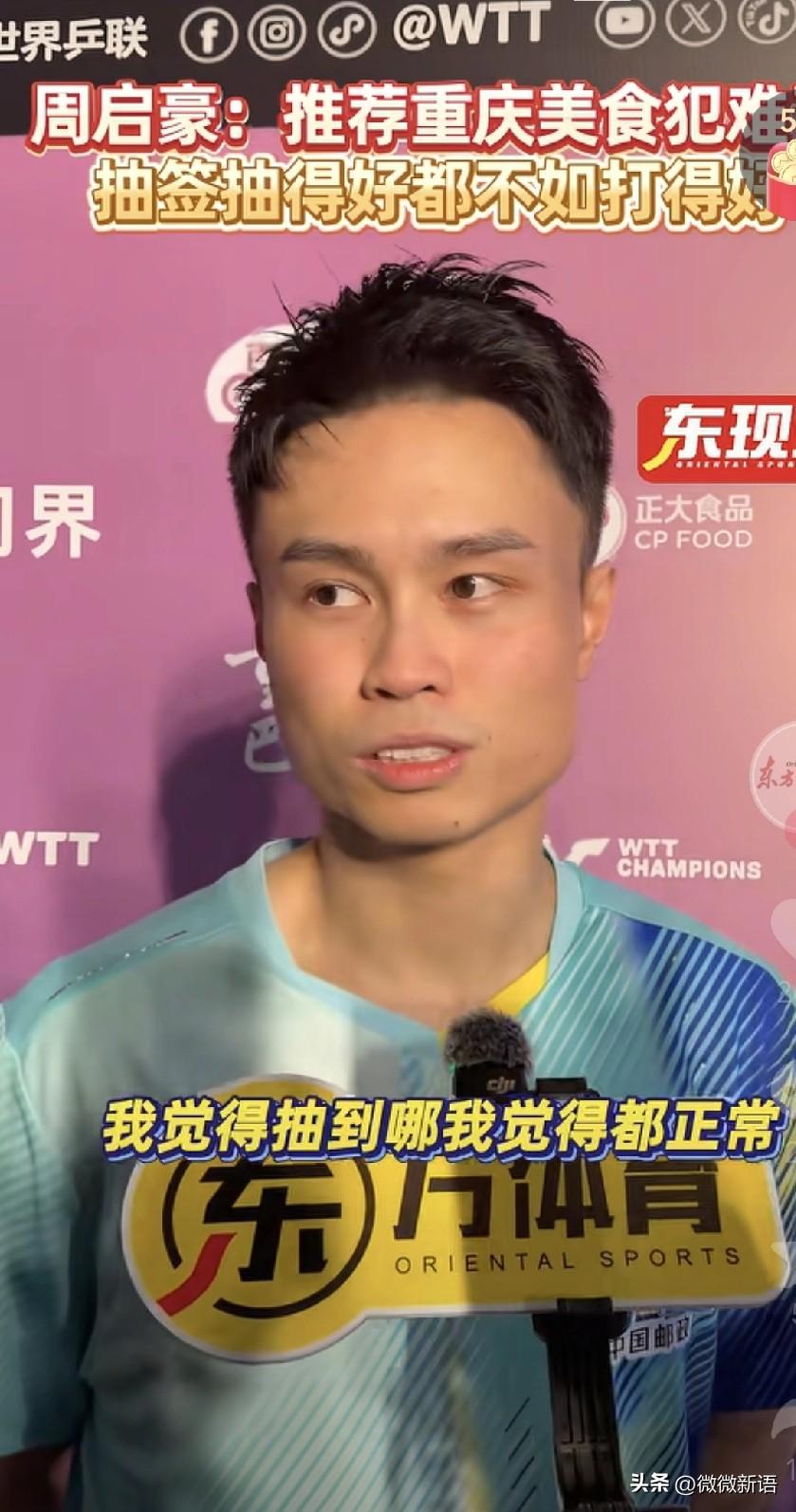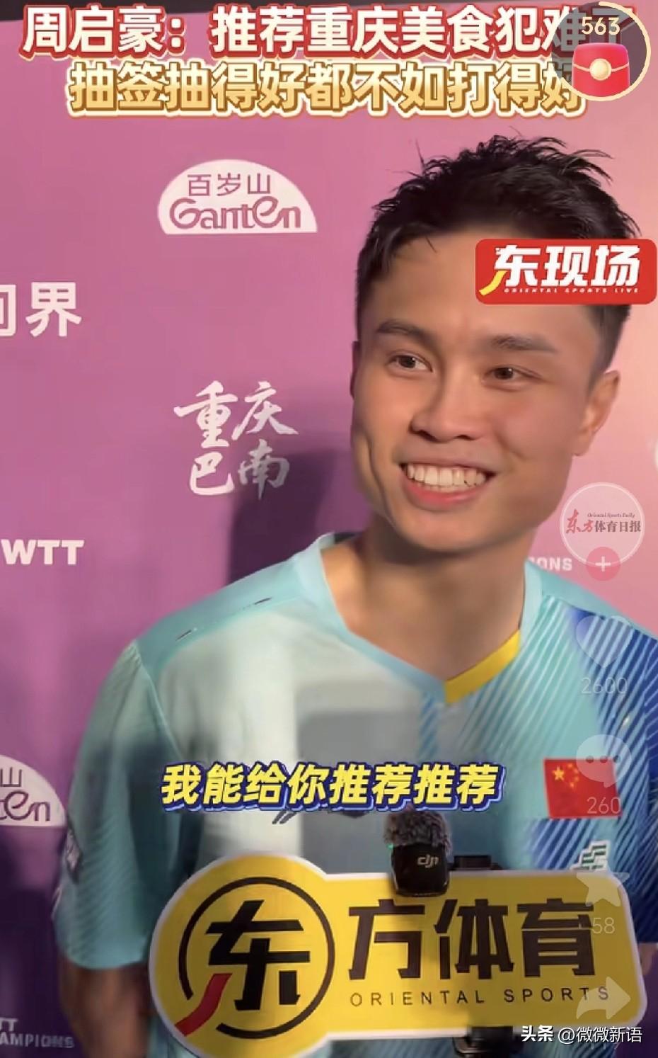 周启豪净说大实话,还挺幽默的。 重庆冠军赛男单1/16决赛,周启豪是3-1赢了队友黄友政,在赛后采访中周启豪说自己和黄友政很熟悉,比赛中还是自己进入状态比较快一些吧。看了今天的赛后采访,每个运动员都会被问到有关重庆的美食,记者让周启豪推荐重庆美食,周启豪犯难了,他说如果让他推荐一些广东美食,那还能给推荐推荐。后面记者问周启豪吃火锅没,周启豪说他对火锅一般,那个小面挺好吃的,就是按两算的。看来周启豪比较喜欢吃面,蒯曼说去年没有在重庆吃上火锅,今年来了也没时间去吃,争取有机会吃顿重庆火锅。 后面有个记者说周启豪对自己的签有什么看法,周启豪说抽的好还不如打的好,不能只说签,也要找客观原因,周启豪真是说的大实话,确实打的好才是真的好。2026年周启豪确实也是靠自己的实力把排名提升了,也能参加大赛。可能看到别的运动员离队,他更珍惜能站在赛场上的时刻吧。 下一轮比赛,周启豪将对阵林昀儒和卡尔森之间的胜者,昨晚周启豪还和小林一起玩,下一场俩人有可能就遇上了,他俩打肯定也会很精彩。今天看到王楚钦和林昀儒两个人在对练,两个人首轮对手都是左手,相互训练也挺好的。