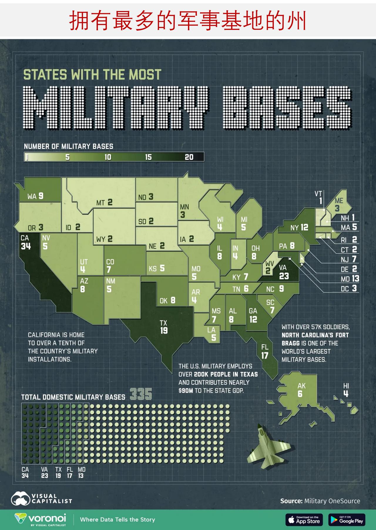 美国军事基地分布在哪里,哪个州拥有最多的军事基地? 美国在全美 50 个州以及